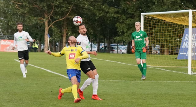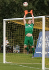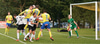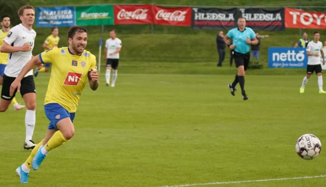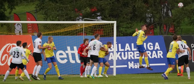 Ívar Örn skallar hornspyrnu Hallgríms fyrir markið á Nökkva sem að skóflar boltanum yfir.