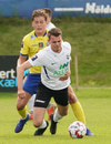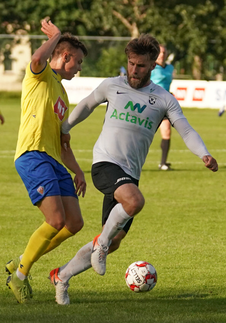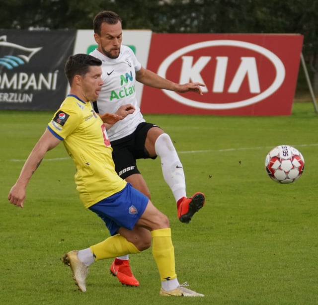 Ásgeir pressar hér Gumma Kristjáns vel og er við það að sleppa í gegn þegar að Brynjar Ásgeir sparkar hann niður. Ásgeir liggur eftir á vellinum.