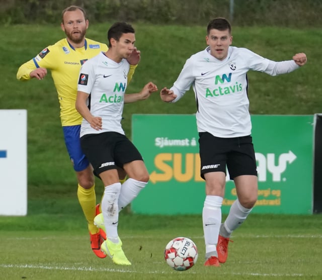 Steinþór kemur hér með skemmtilega sendingu inná Ásgeir sem að er kominn í þröngt færi en hann er réttilega flaggaður rangstæður.