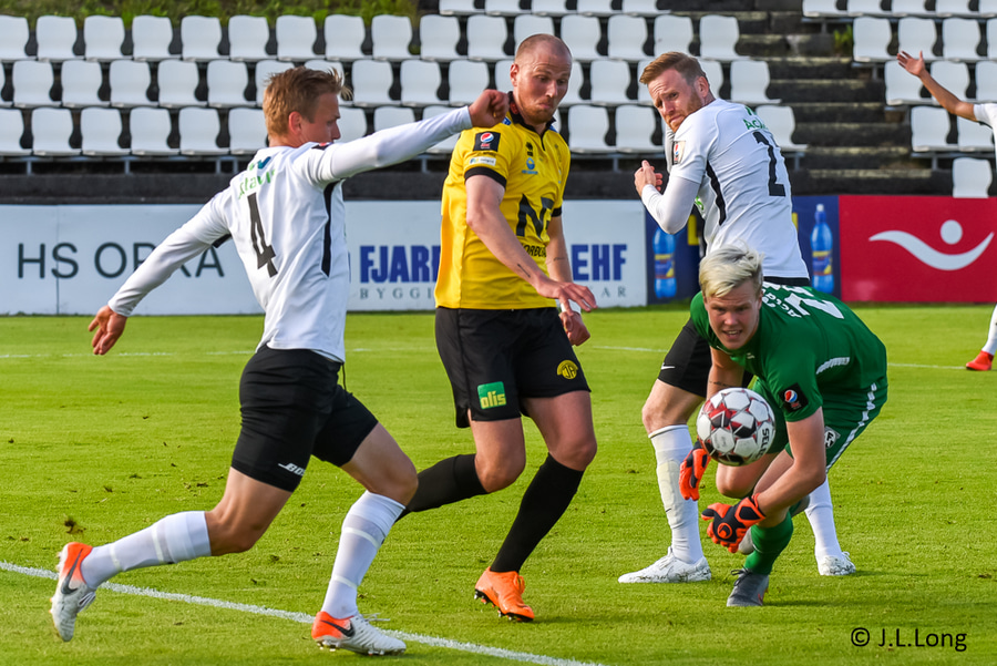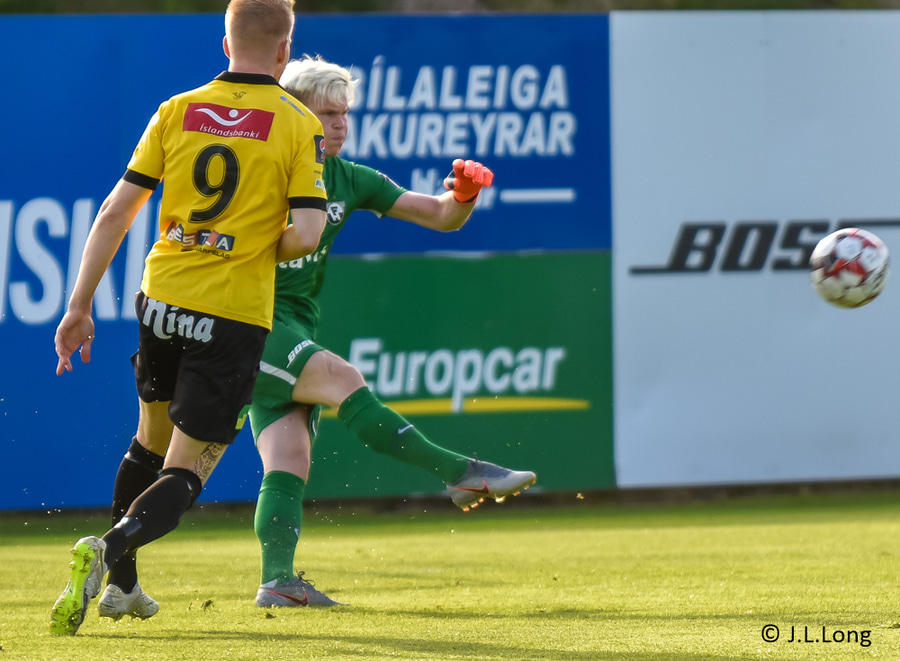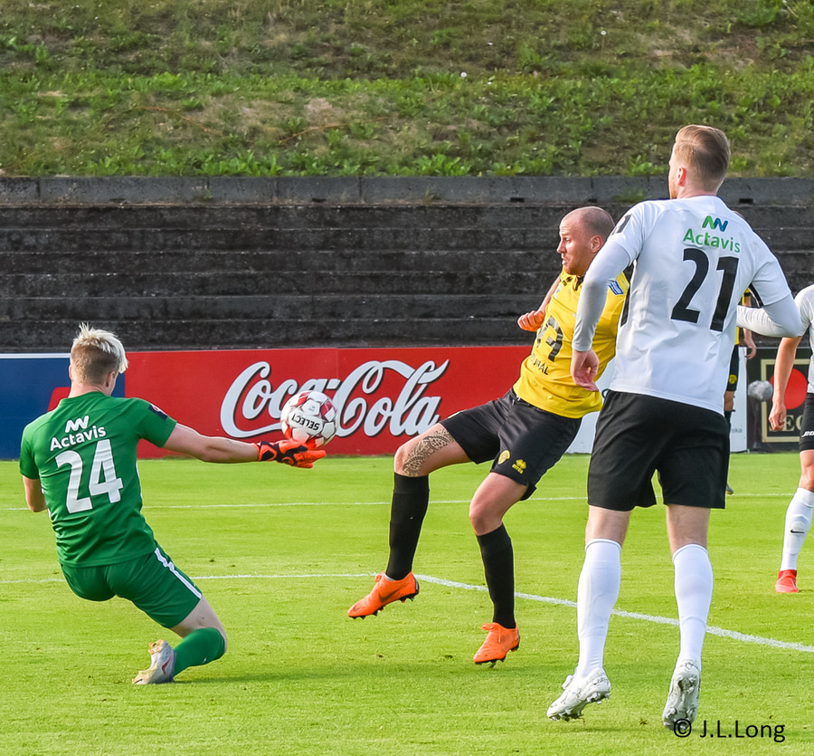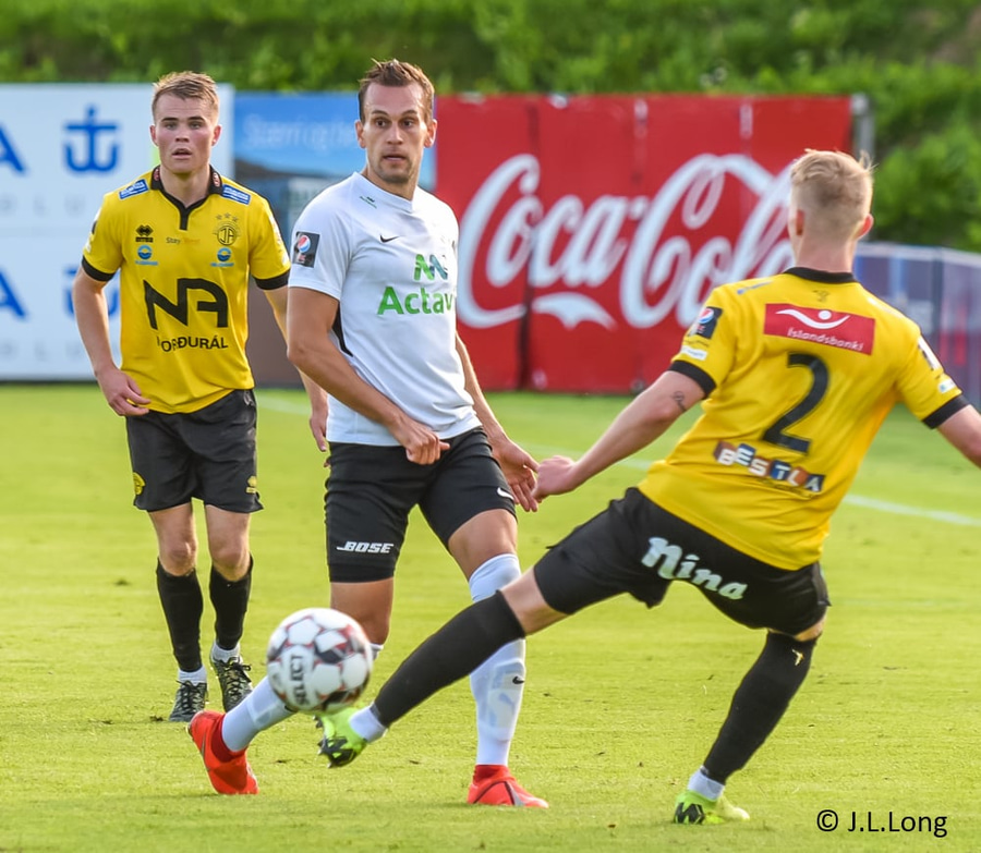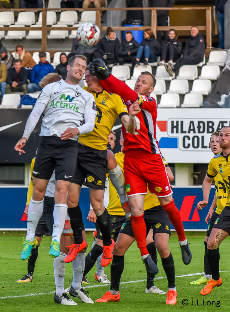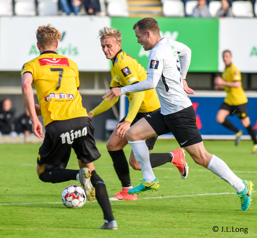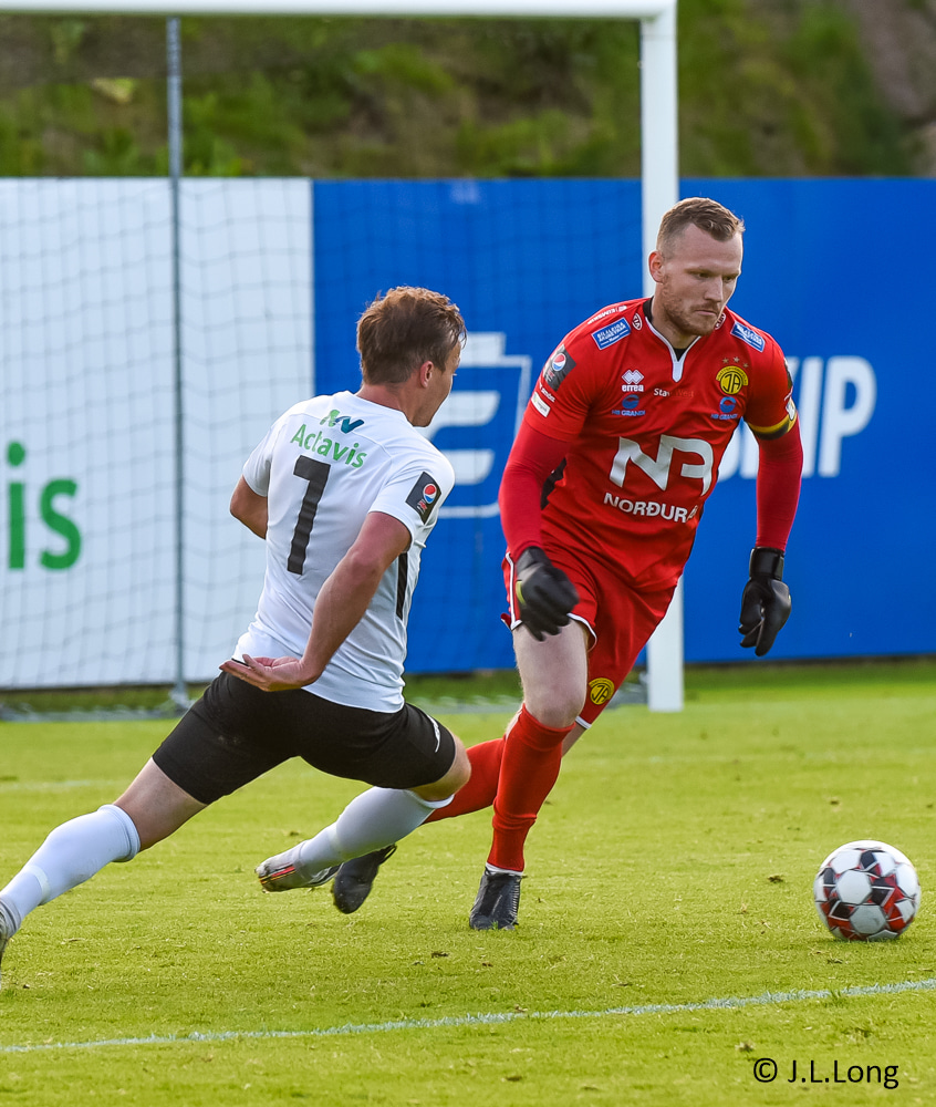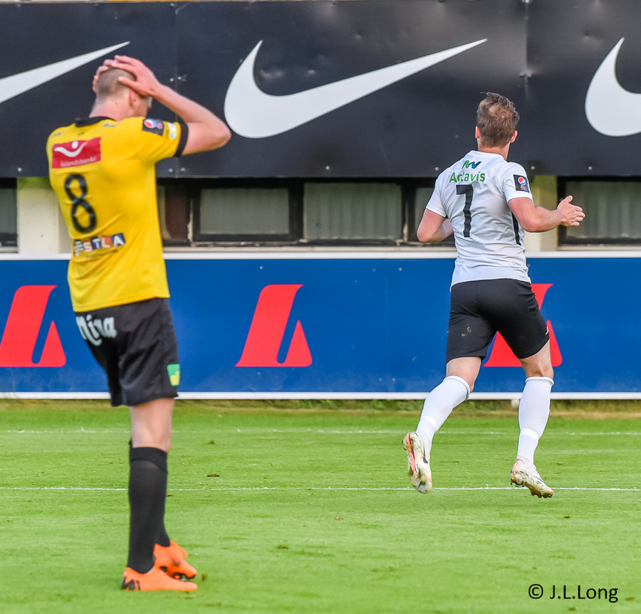 Misskilningur milli Hödda og Halls sem missa boltann á milli sín og Morten kemst í boltann en nær ekki að gera sér mat úr þessu.