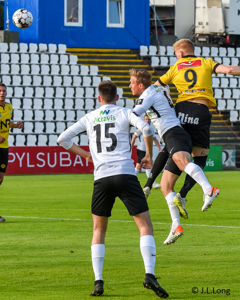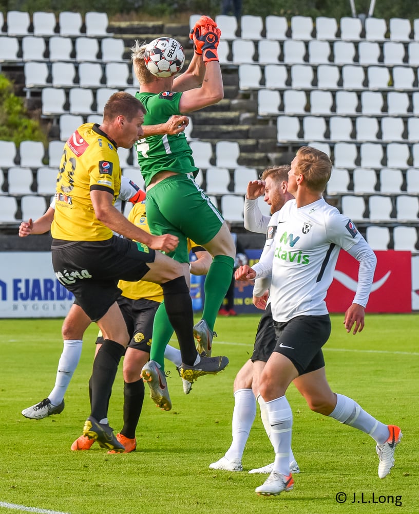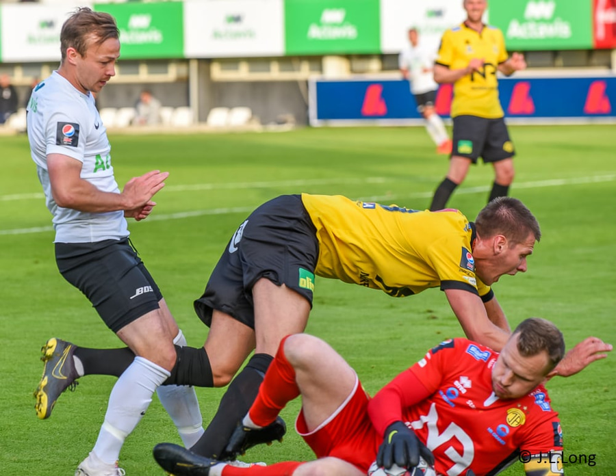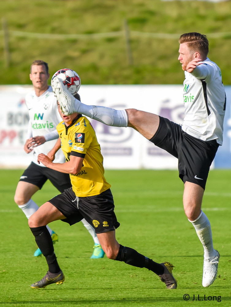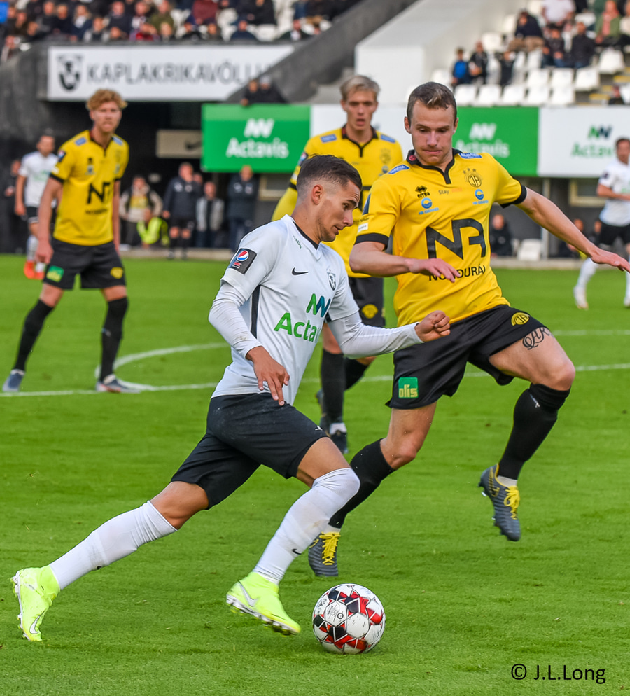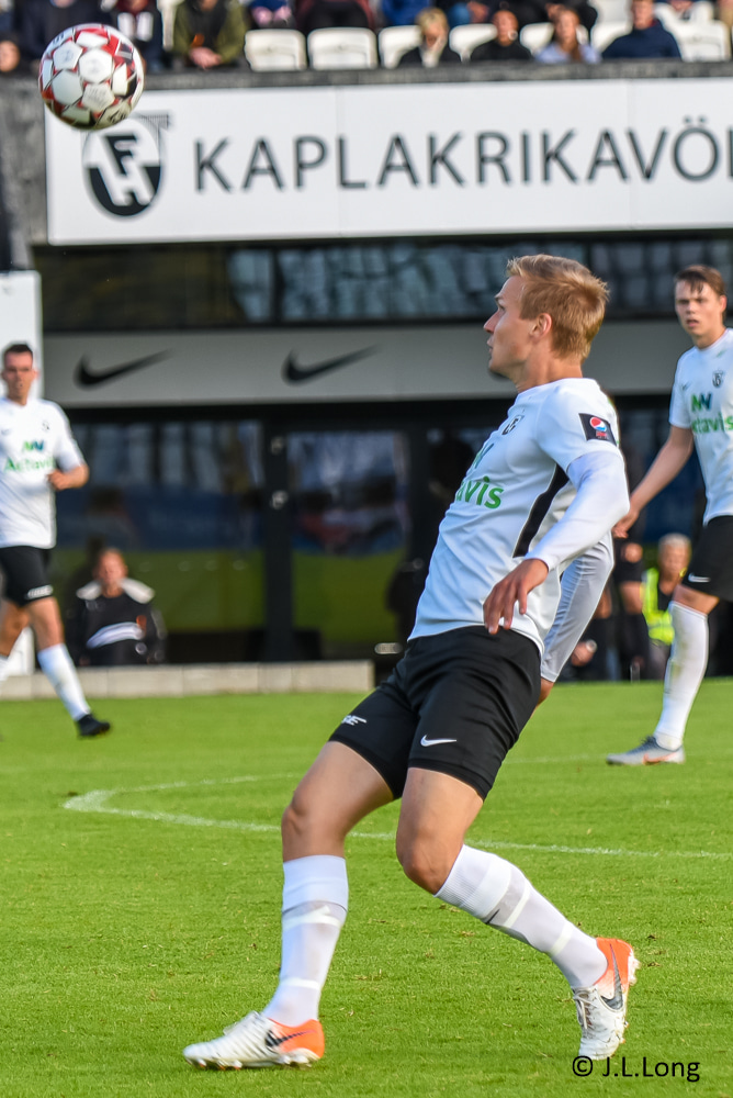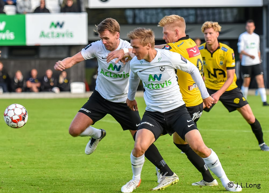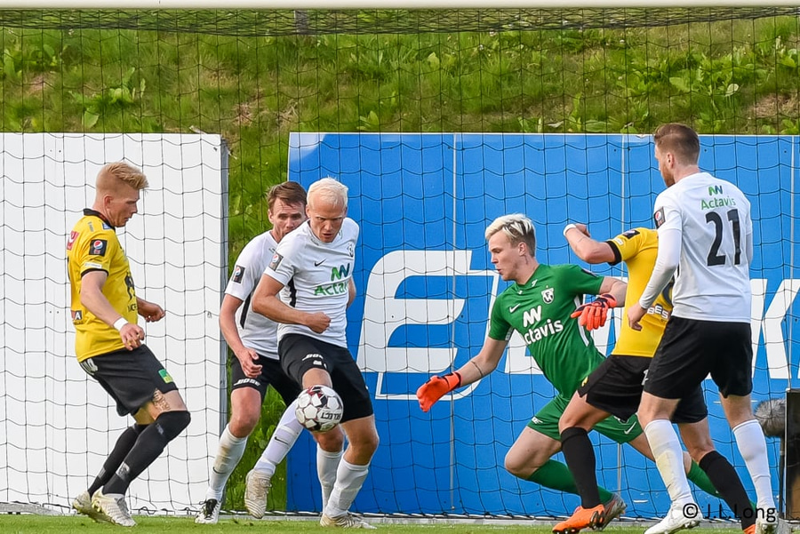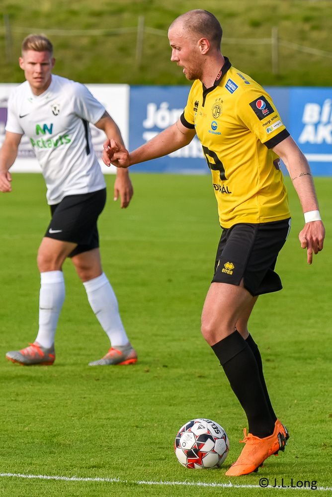 Misskilningur milli Hödda og Halls sem missa boltann á milli sín og Morten kemst í boltann en nær ekki að gera sér mat úr þessu.