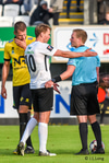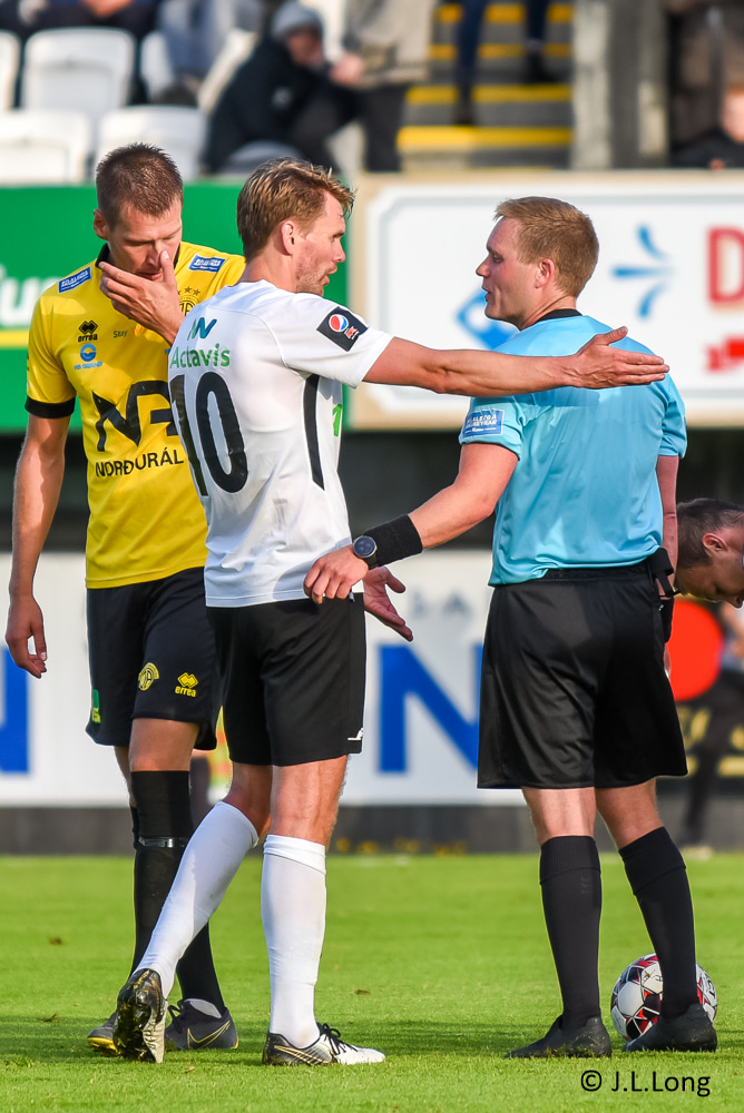 Já! - Sindri Snær straujar Björn Daníel á miðjunni og Egill fer í vasann eins og hann ætli að gefa honum spjald en hættir við, þetta mátti alveg vera gult!