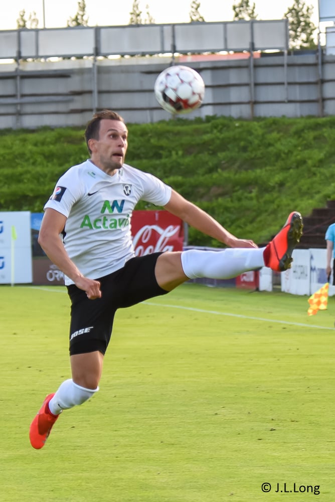 Hann fær boltann á kollinn með bakið í markið og flikkaði boltanum með bakinu í gegnum klofið á Halli Flosa og hamrar boltann svo með vinstri upp í þaknetið á nær!
