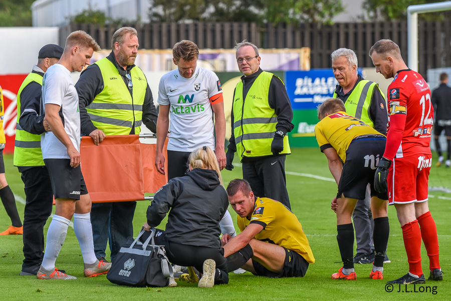 Marcus liggur eftir og gæslan hleypur inná með börurnar.