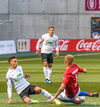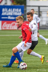 Jónatan Ingi alltof seinn í tæklingu á Hauk Pál og fær gult að launum. Meiðir sig fyrir vikið enda eins og að tækla múrvegg.