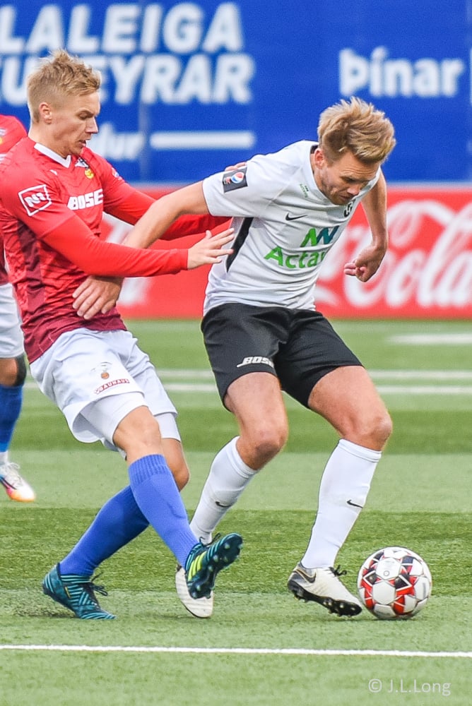 Hér er Sigurður Egill við það að sleppa í gegn en Pétur Viðars nær draumatæklingu og kemur boltanum frá.