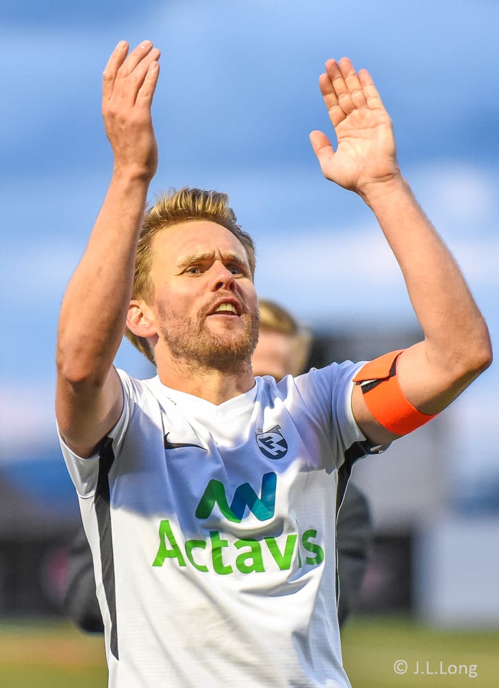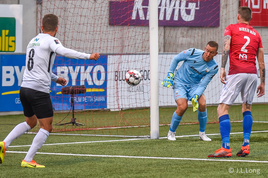 Steven Lennon reynir hér enn eitt skotið eftir góðan undirbúning Jónatans en enn og aftur er skotið yfir markið.