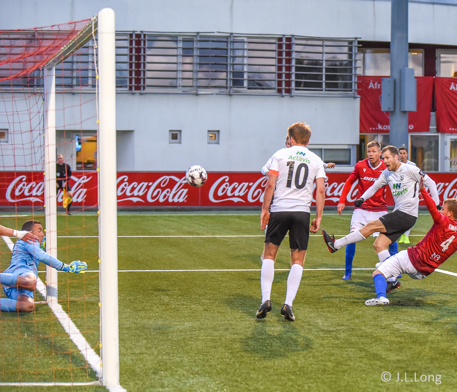Þórður Þorsteinn með draumafyrirgjöf beint á kollinn á Morten Beck en skalli hans fer rétt framhjá markinu. Algjört dauðafæri.