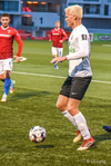 Þá ganga liðin á völlinn og heilsa heiðursgesti kvöldsins en það er Jóhannes Eðvaldsson, fyrrum fyrirliði Vals.