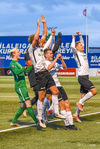 Hornspyrnan er góð og ratar beint á kollinn á Eiði Aroni en FH-ingar ná að komast fyrir skalla hans.