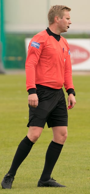 Keflvíkingar eru brjálaðir við Svein og virðast vilja vítaspyrnu eftir aukaspyrnuna, en fá einungis hornspyrnu.