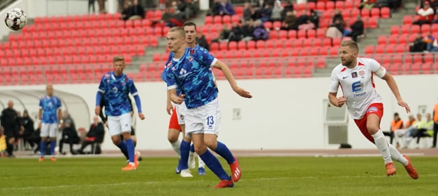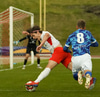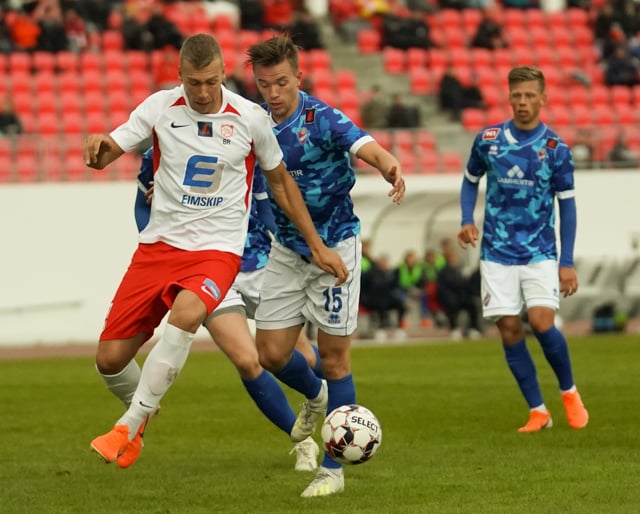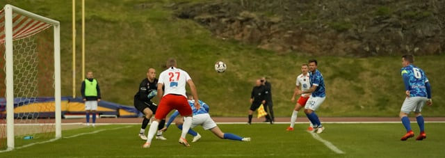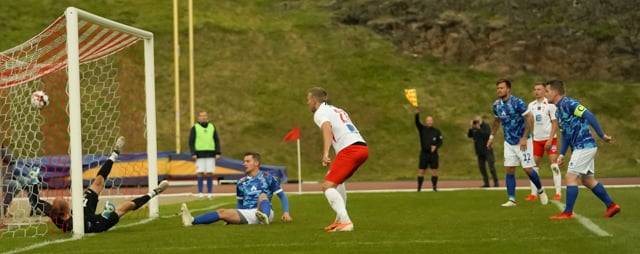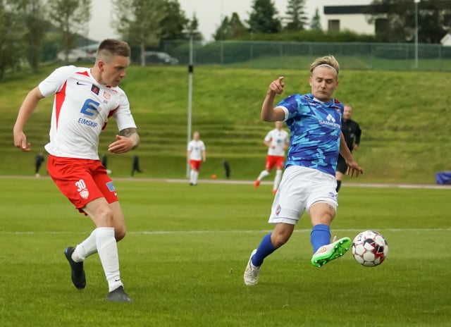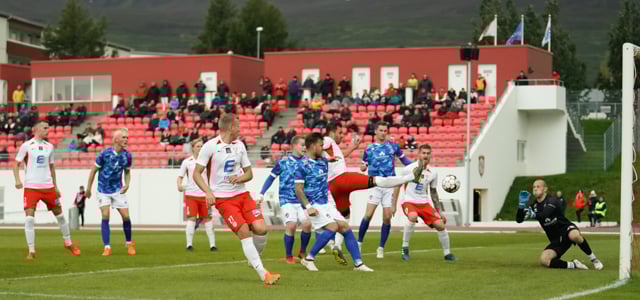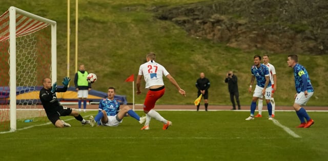 Jónas með frábæra stungsendingu á Bjarka Þór, sem setur fyrirgjöfina í varnarmann og útaf.