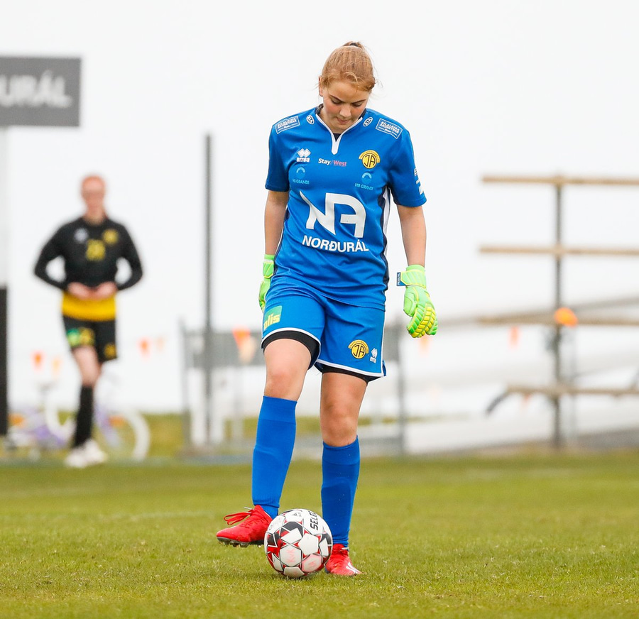 Fyrsta verk Þórkötlu Maríu í leiknum er að eiga þrumuskot að Skagamarkinu! Aníta ver vel.