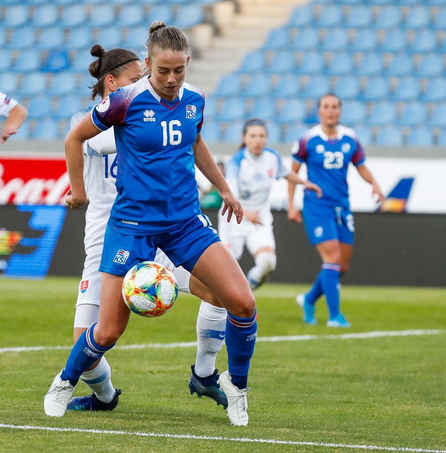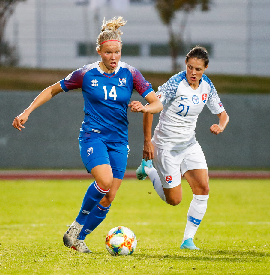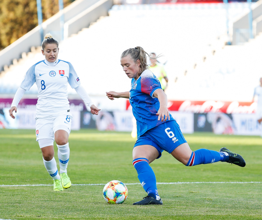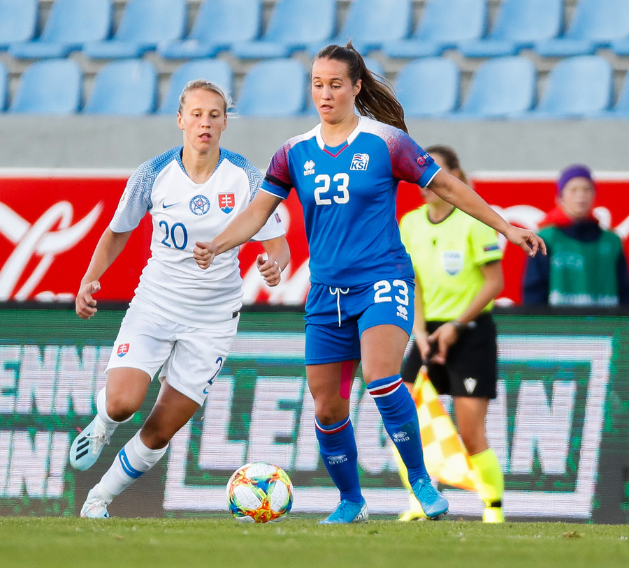 Elín Metta snýr af sér leikmann inn í teig hjá Slóvakíu og finnur Söru sem kemur á fleygiferð inn í teiginn. Varnamaður Slóvakíu kemst hinsvegar á milli Söru og boltans og kemur hættunni frá.
