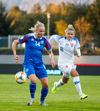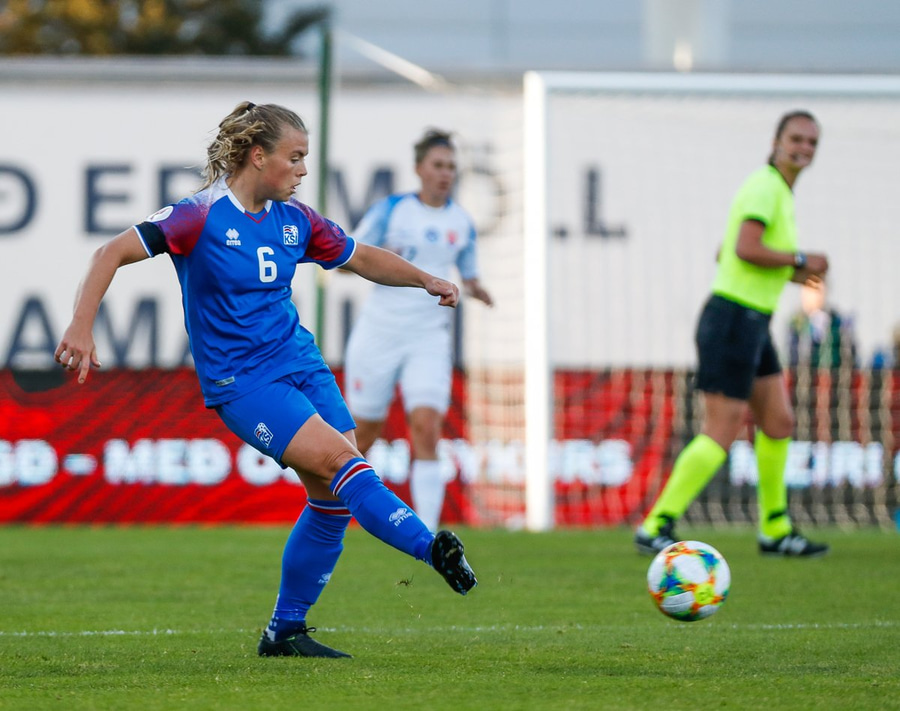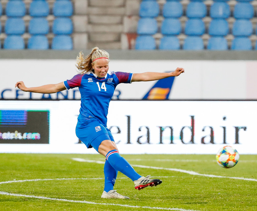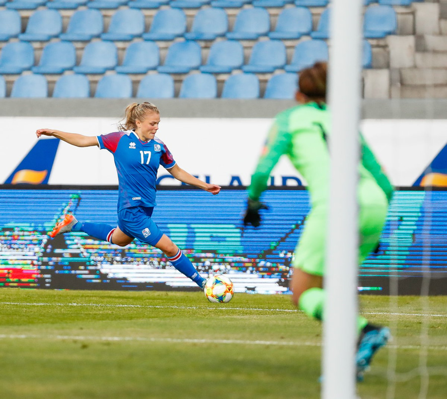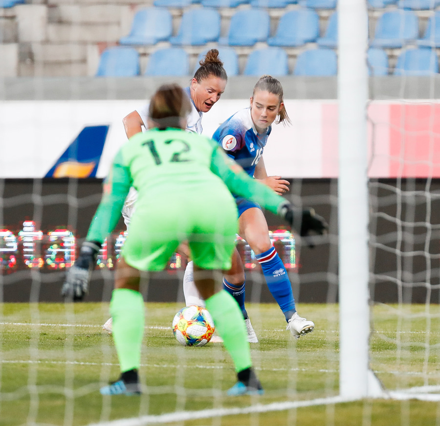 Hallbera með flottan sprett upp kantinn sem endar með skalla frá Dagný sem fer rétt framhjá!
