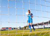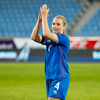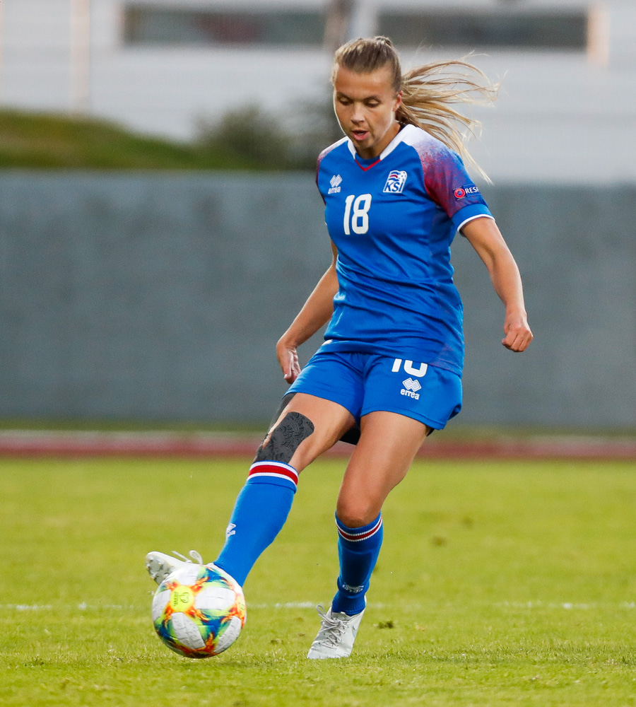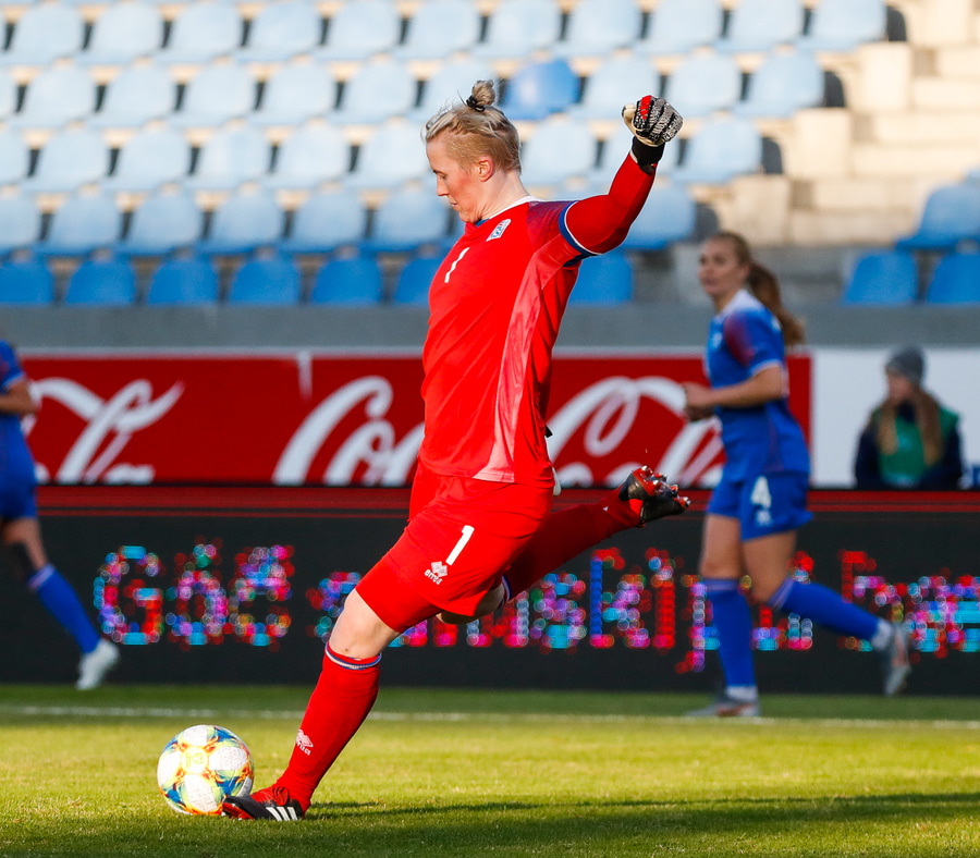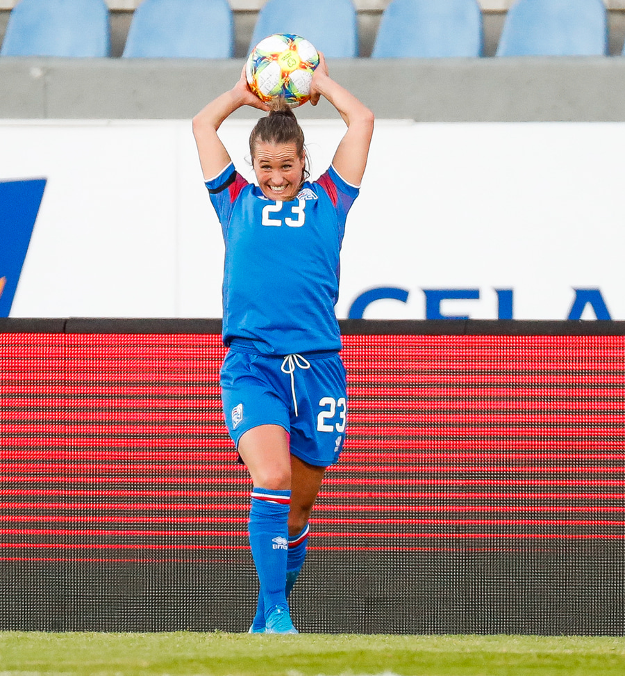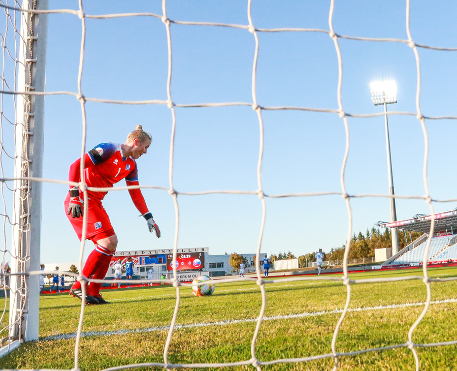 Elín Metta fær aukaspyrnu rétt fyrir utan teig. Hallbera er með flottan bolta sem að mér sýnist að Maria í markinu missir frá sér.