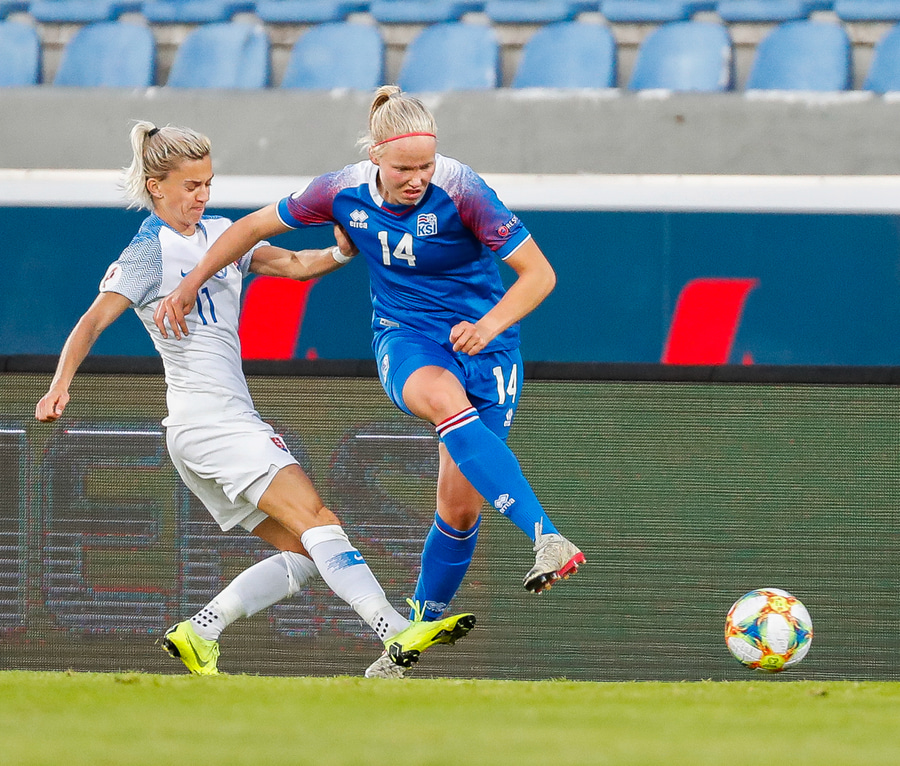 Maria Mikolajová tekur spyrnuna en Dagný nær að skalla í burtu.
