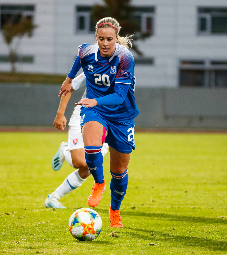 Stuttu seinna gerir Hallbera vel og setur fínan bolta fyrir mark Slóvakíu. Enginn íslendingur nær þó til boltans.