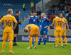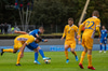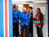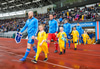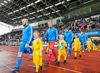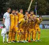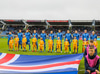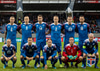 Íslenska liðið að sjálfsögðu í sínum bláu aðalbúningum í dag á meðan Moldóvar eru gulir. Dómaratríóið svartklætt.