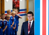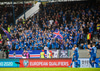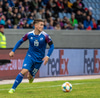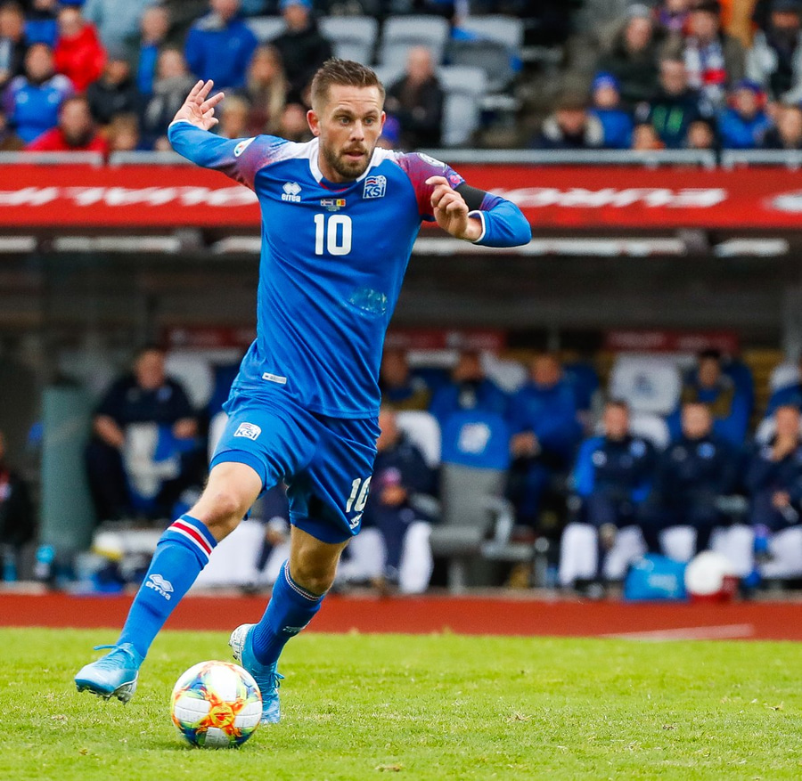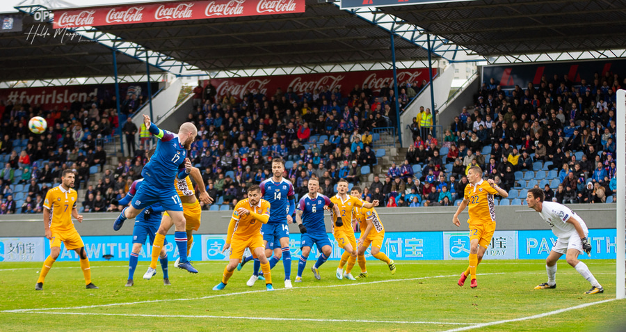 Það íslenska liðið sem að hefur leik með boltann og sækir í átt að Laugardalshöll. Gylfi Þór á fyrstu spyrnu leiksins.