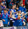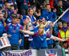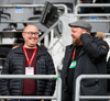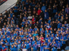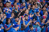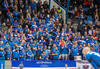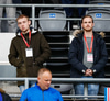 Áhorfendur rísa úr sætum og hlýða á þjóðsöngva.