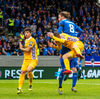 Aftur er það Aron Einar sem að skallar boltann burt.