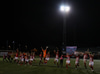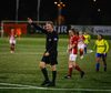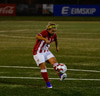 Shannon Simon tekur upphafsspyrnuna fyrir Grindavík sem leikur í átt að miðbænum.