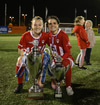 Góðu dagsverki lokið hjá Möggu sem skoraði þrjú í kvöld. Hin efnilega Tinna Dögg kemur inná.