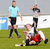 Gauti Gautason tæklar Jóhann Helga og þá láta leikmenn heyra í sér. Gauti segist bara hafa tekið boltann, en Þórsarar eru á öðru máli. Aukaspyrna sem Þórsarar fá.