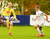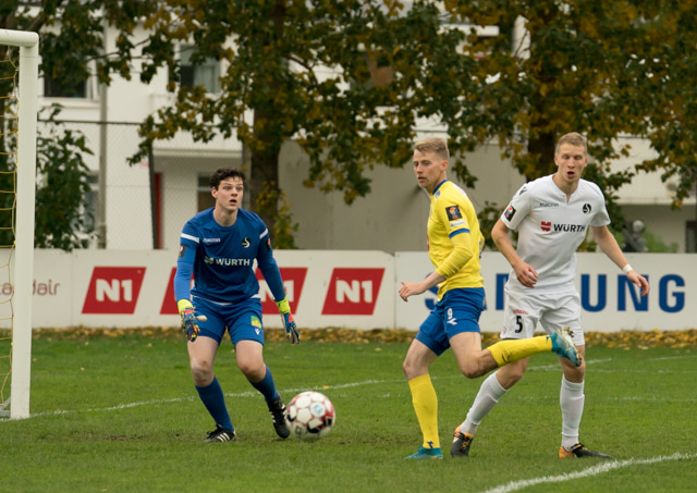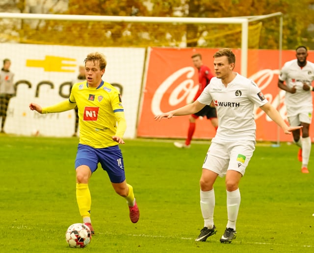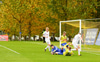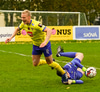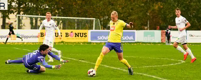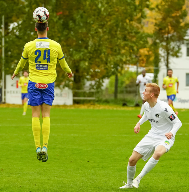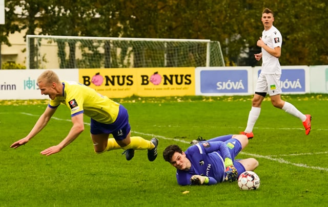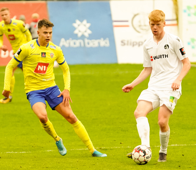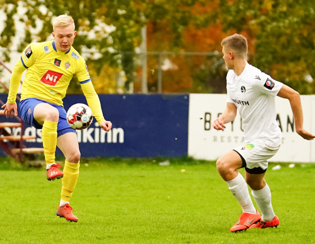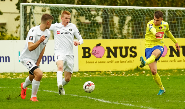 Nökkvi vinnur baráttu við Valdimar upp við vítateig. Nær skoti úr þröngri stöðu en boltinn rétt framhjá.