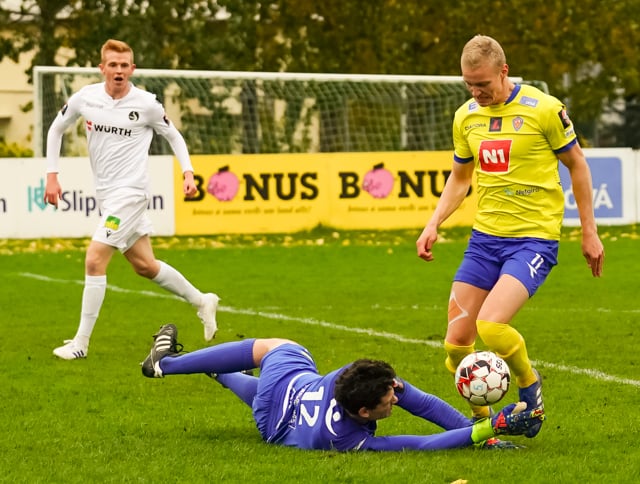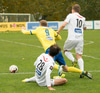 Valdimar sparkar boltanum úr höndunum á Aron Dag sem liggur eftir og þarf aðhlynningu.