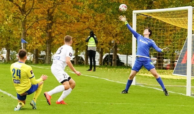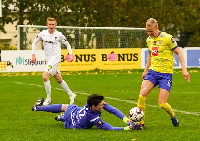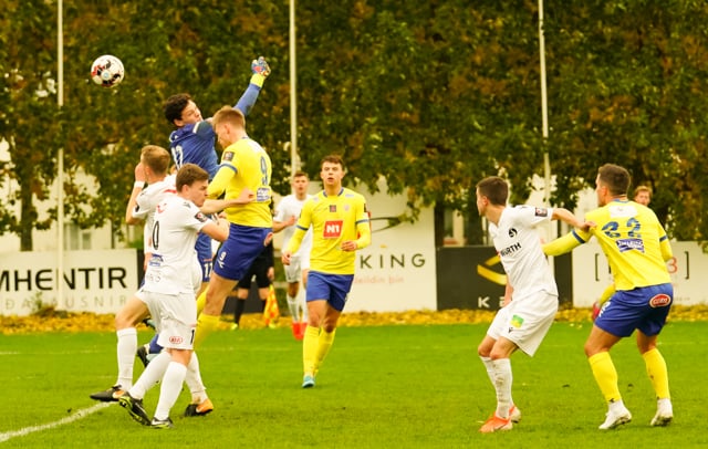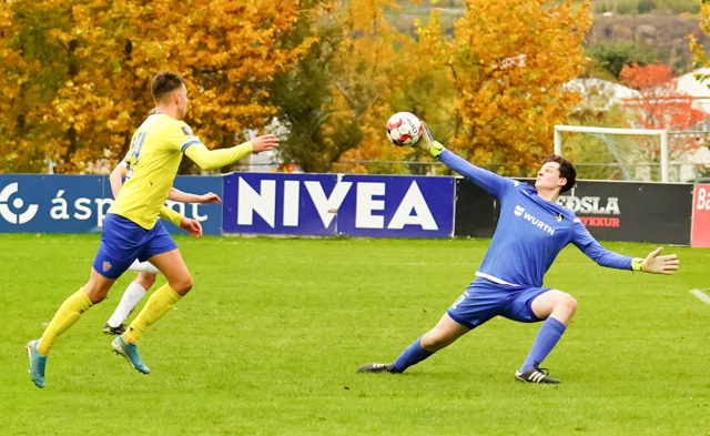 Andrés Már með fína fyrirgjöf frá hægri en Aron Dagur stekkur manna hæst og handsamar boltann.