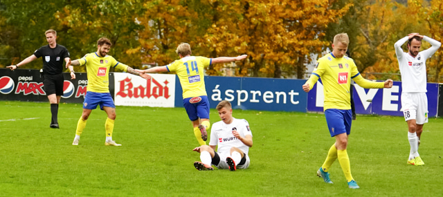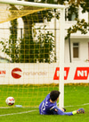 Hallgrímur ekki á sama máli að þetta hafi verið fín fyrirgjafastaða. Hann reynir skot sem fer hátt og langt frá markinu.