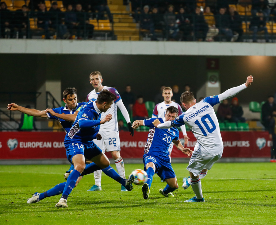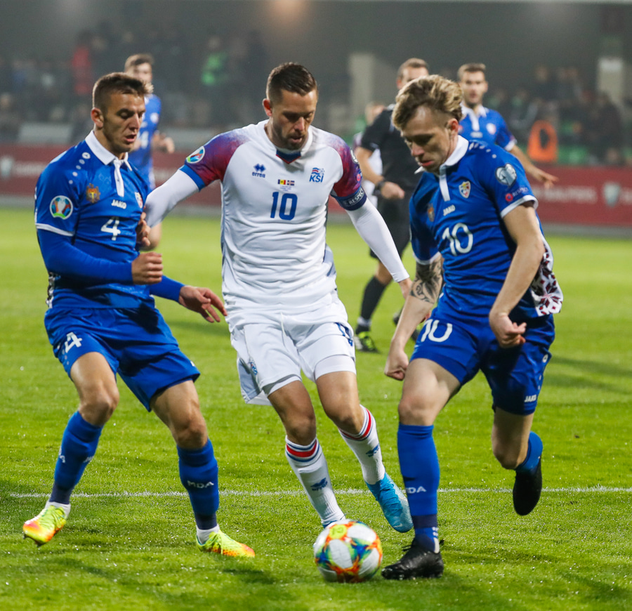 Gylfi klúðrar. Marvörður Moldóvu varði vel frá honum.