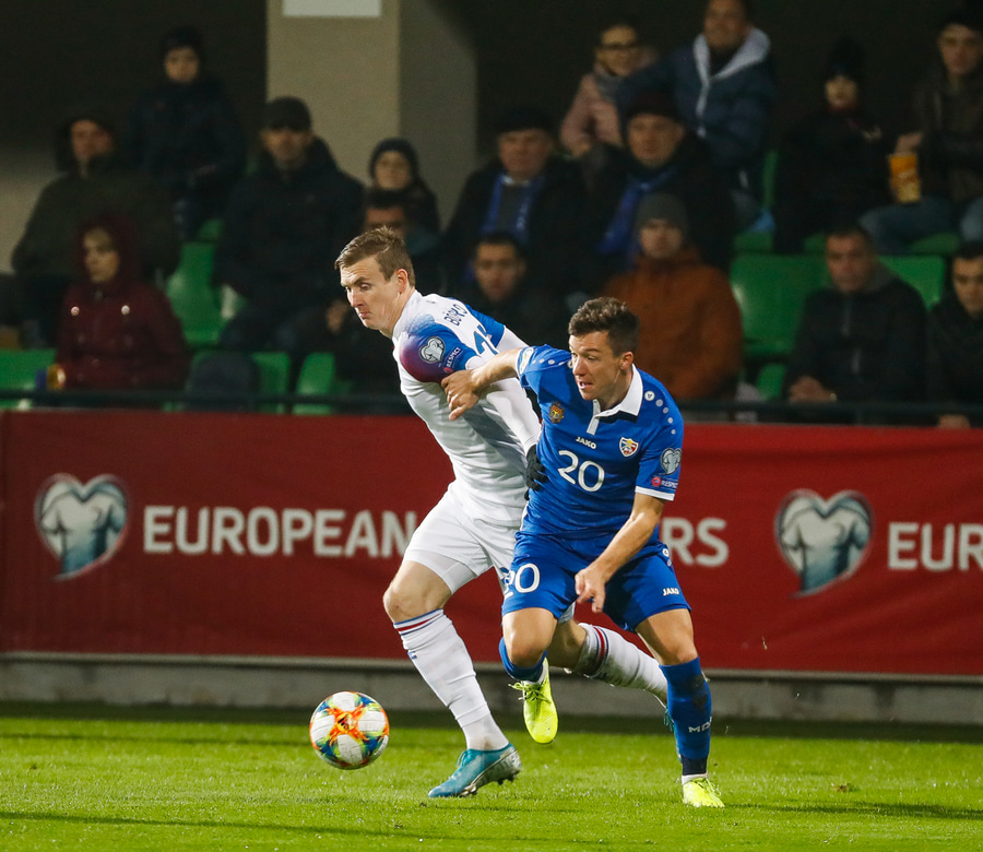 Slæmdi hendinni í andlit leikmanns Moldóvu að mati dómarans.