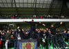 Íslensku áhorfendurnir eru ekki fjölmennir en eru í stuði og duglegir að láta í sér heyra. Hafa samt enn ekki reynt við Víkingaklappið.
