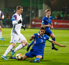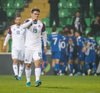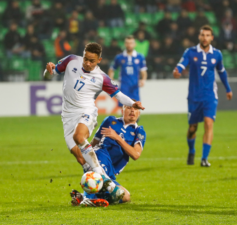 Gott spil hjá Íslandi. Viðar kemst í hörkufæri en Koselev í markinu lokar á hann.