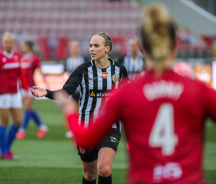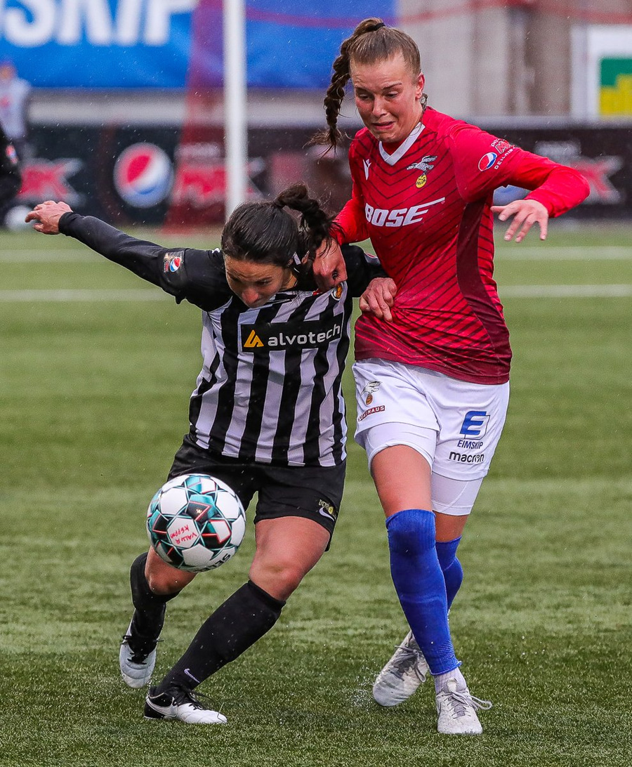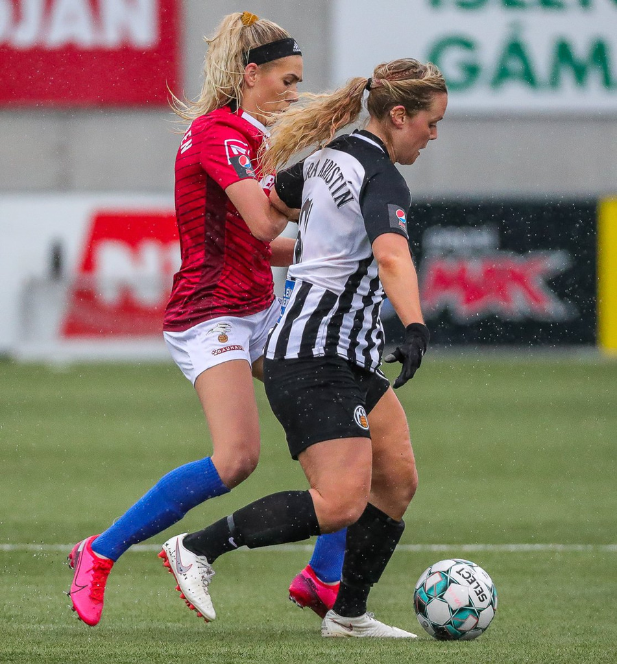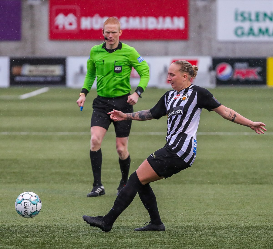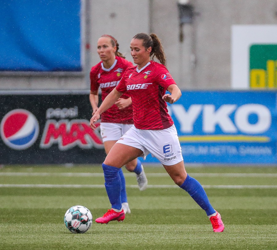 Katrín finnur Þórdísi á miðjunni, hún snýr vel en missir boltann of langt frá sér. Rennir sér í hann með takkana of dónalega á undan sér og aukaspyrna