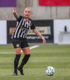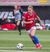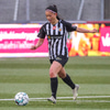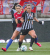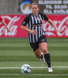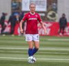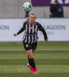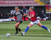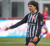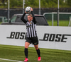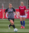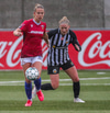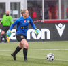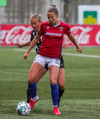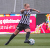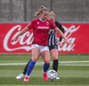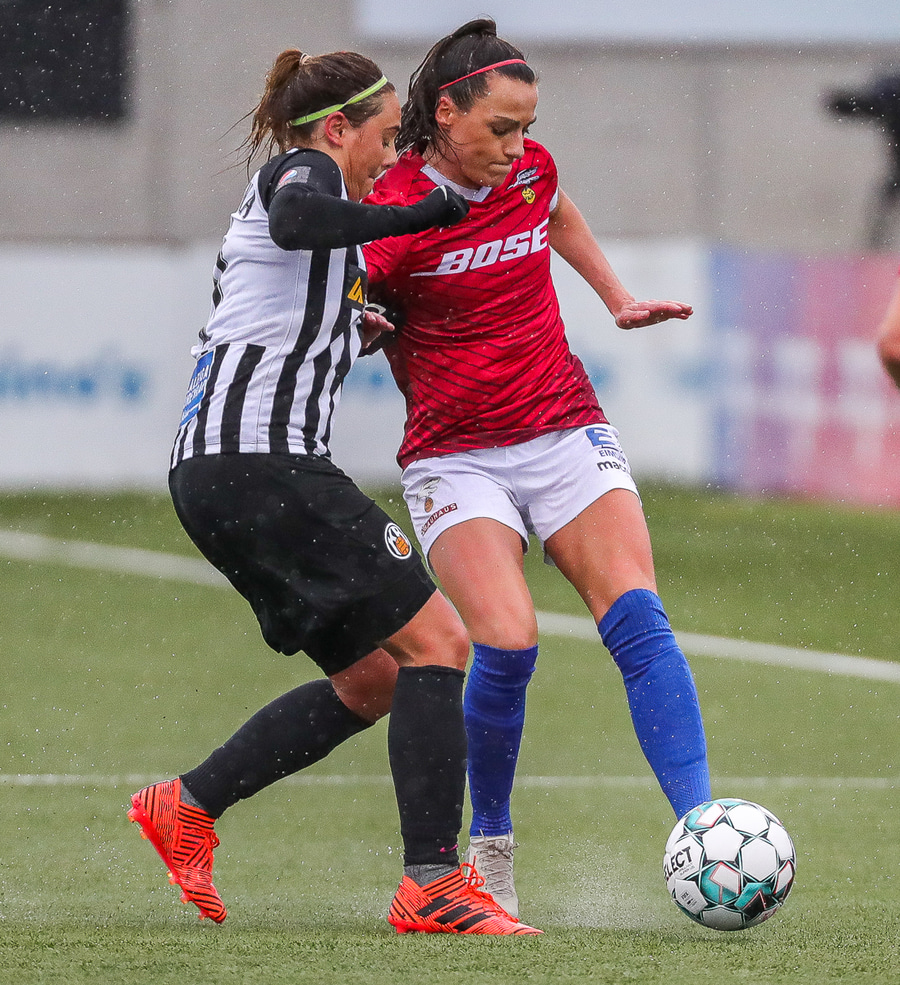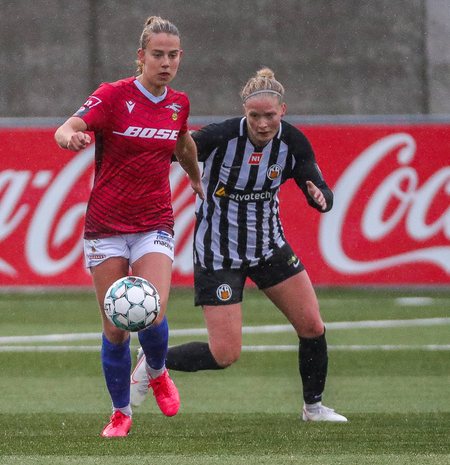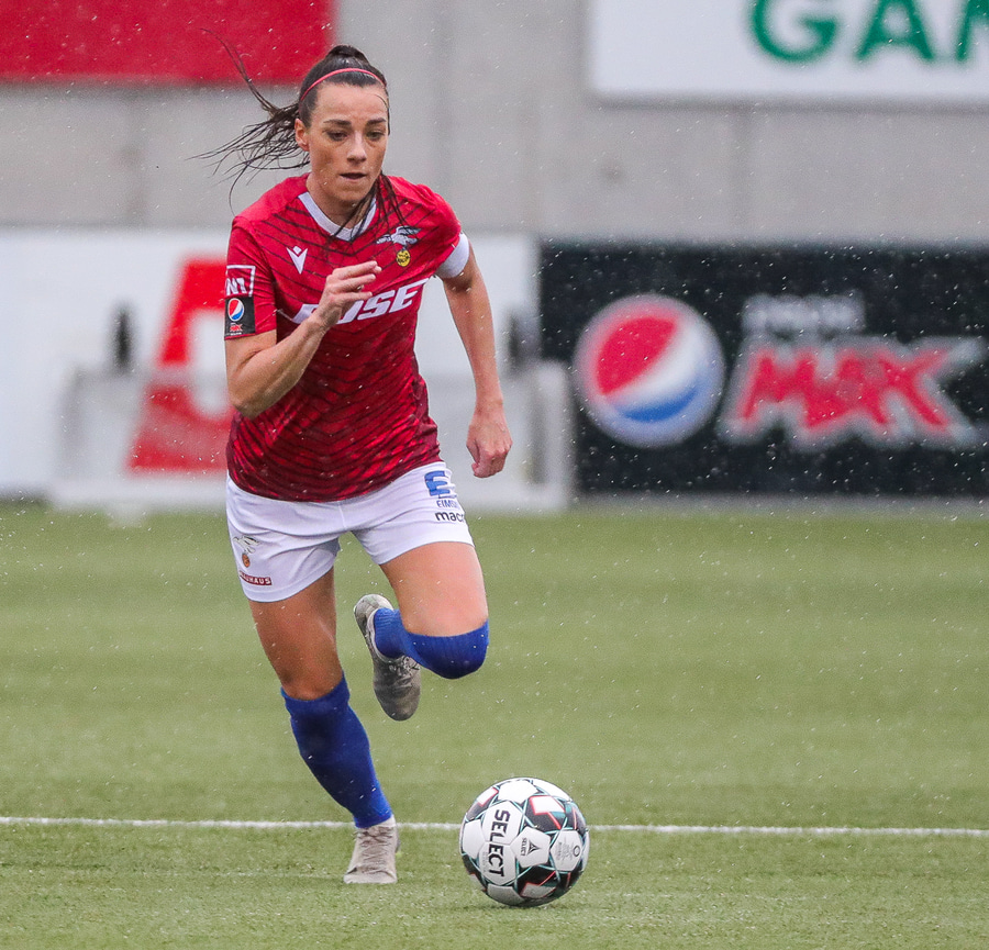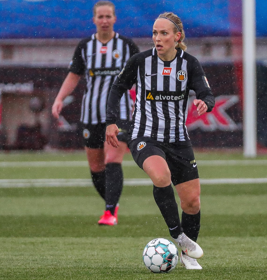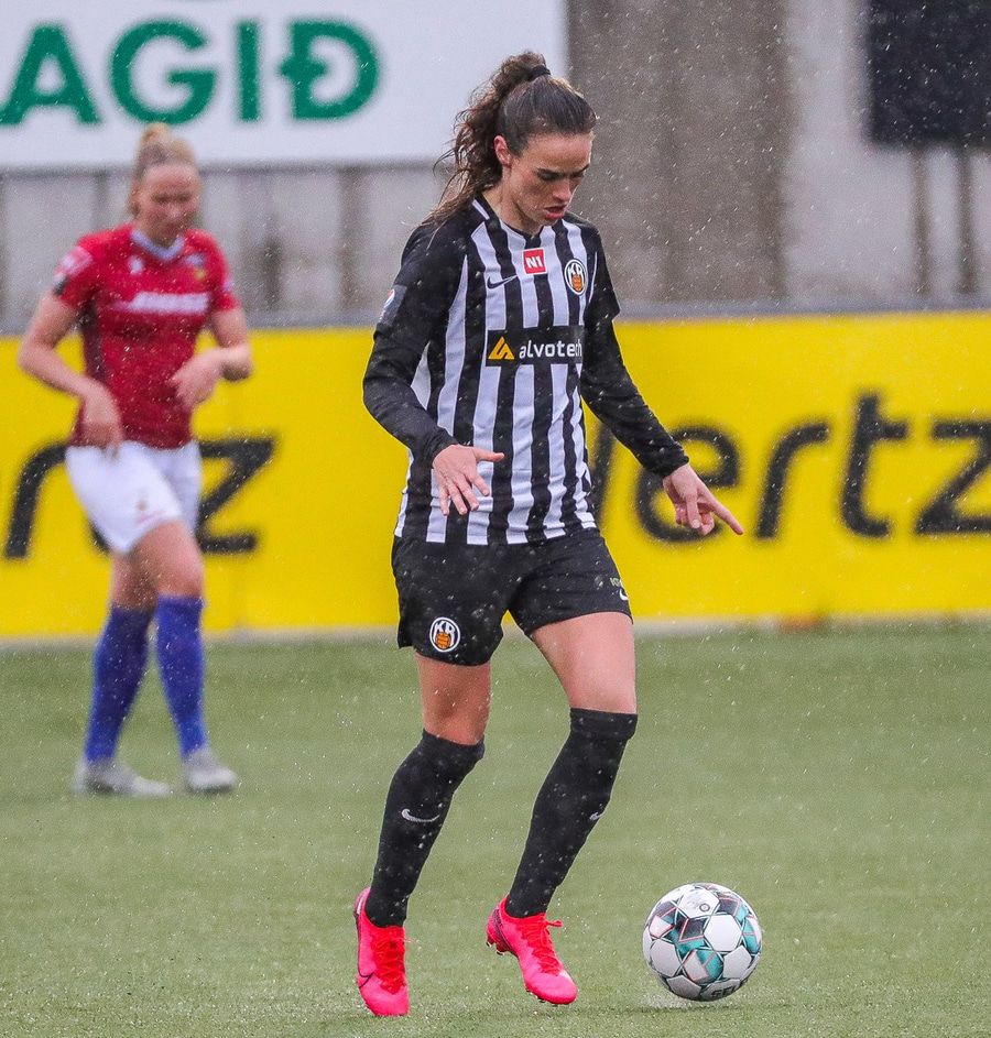 Katrín finnur Þórdísi á miðjunni, hún snýr vel en missir boltann of langt frá sér. Rennir sér í hann með takkana of dónalega á undan sér og aukaspyrna