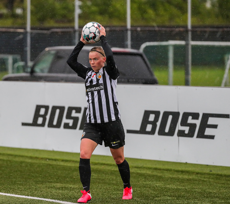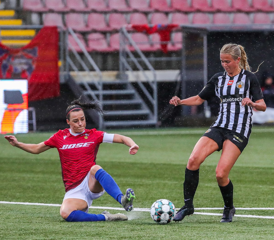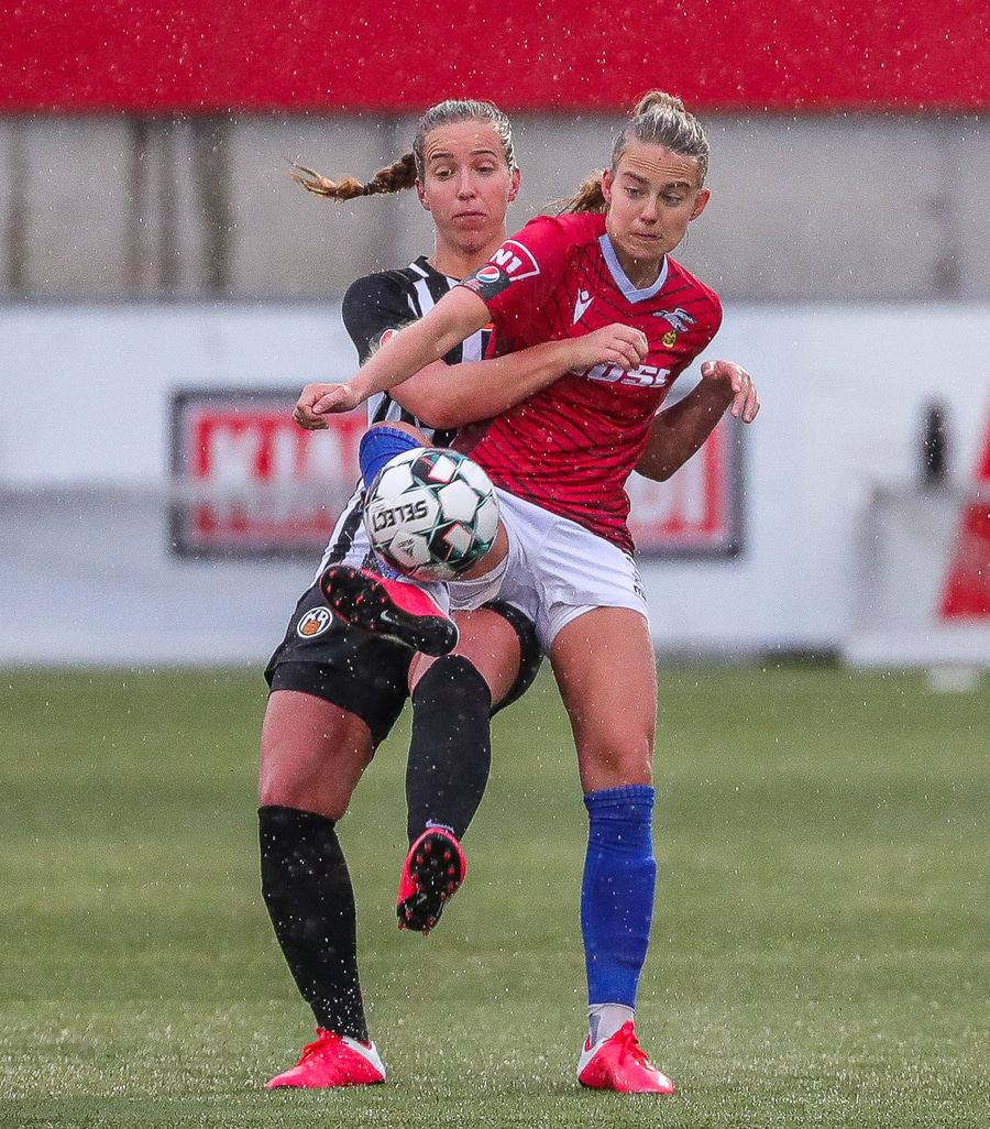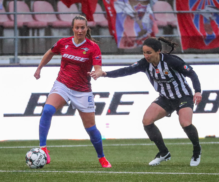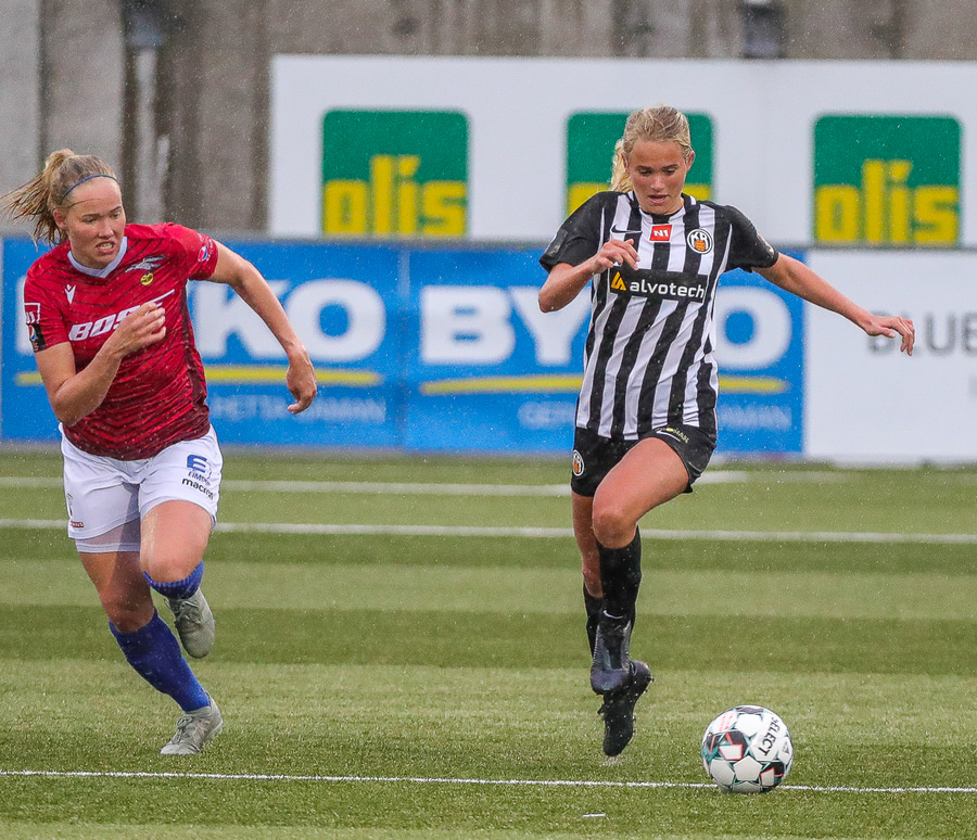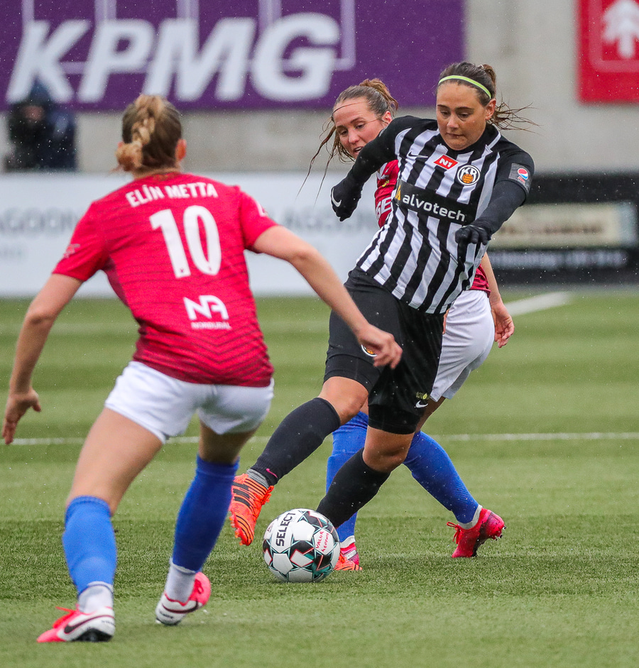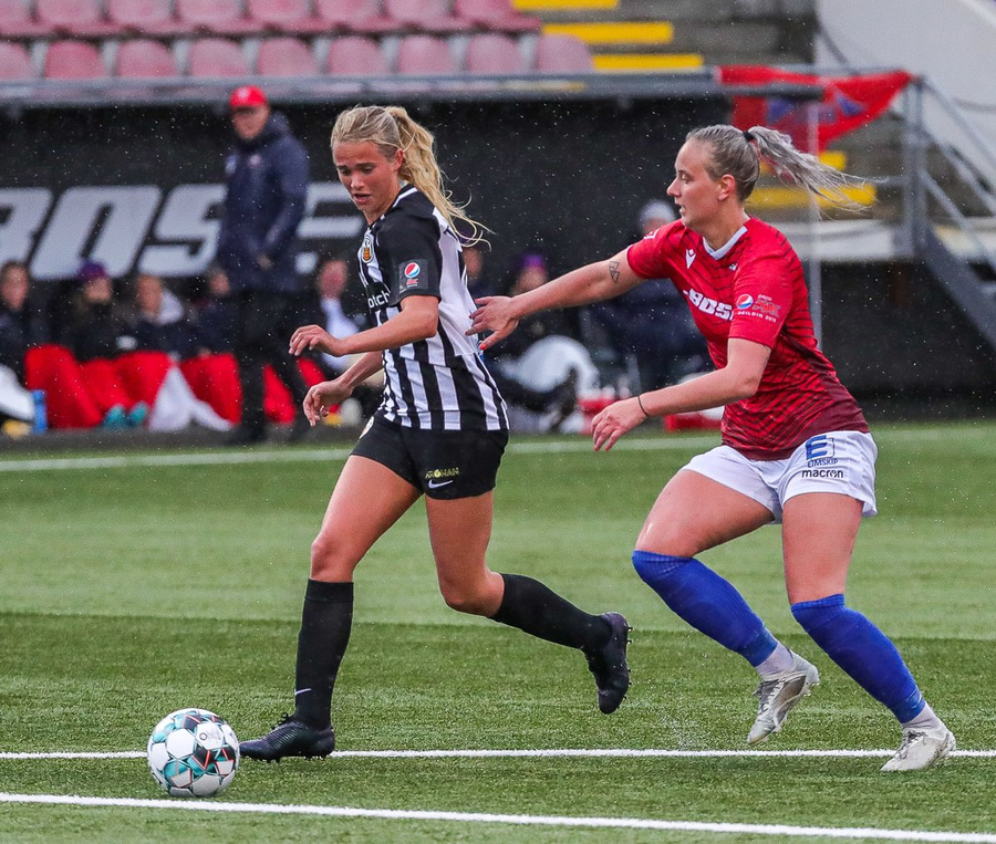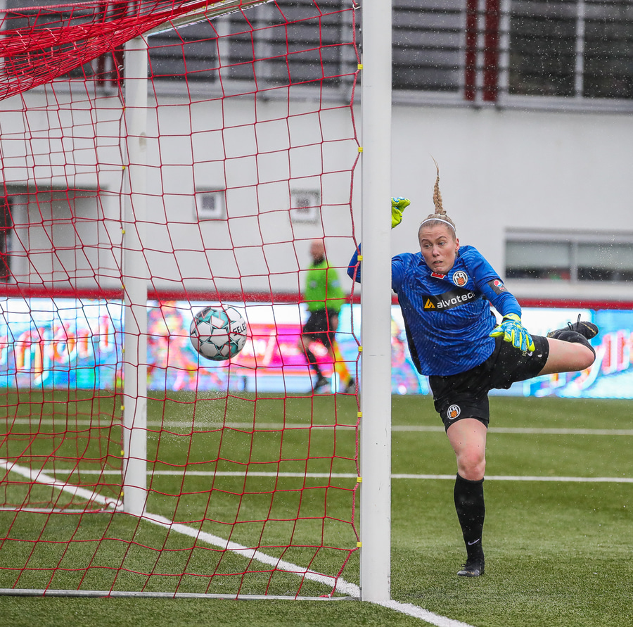 Vel gert Elín Metta! Snýr Þórunni Helgu svakalega snyrtilega af sér og setur hann út til hægri á Hlín. Nær sendingu fyrir. Boltinn rúllar svo framhjá fjærstönginni