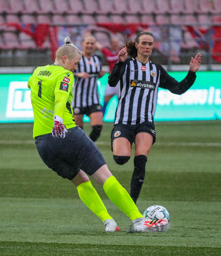 Hvað er að gerast?? Guðný er með boltann inn í teig og gerir ráð fyrir að Sandra taki hann. Katrín Ómars stígur inn í hana og er ein á móti Söndru! Þetta fer réttframhjá!!