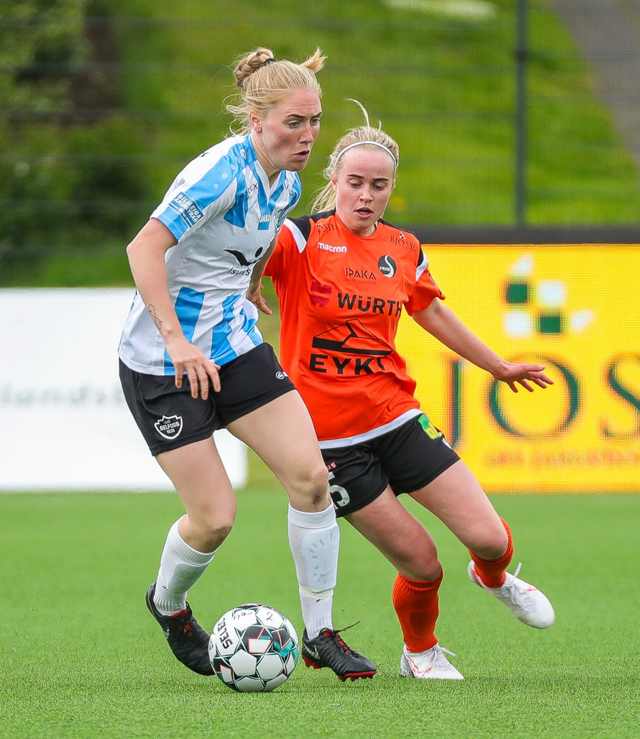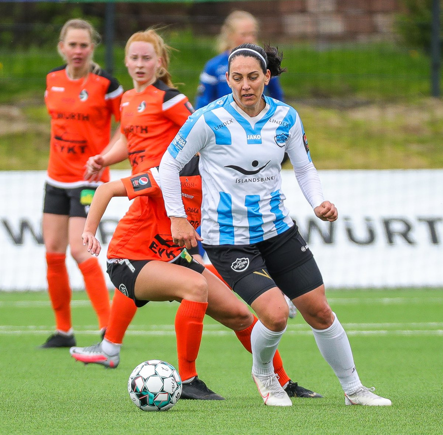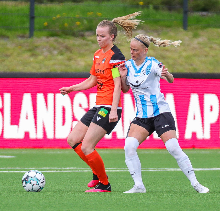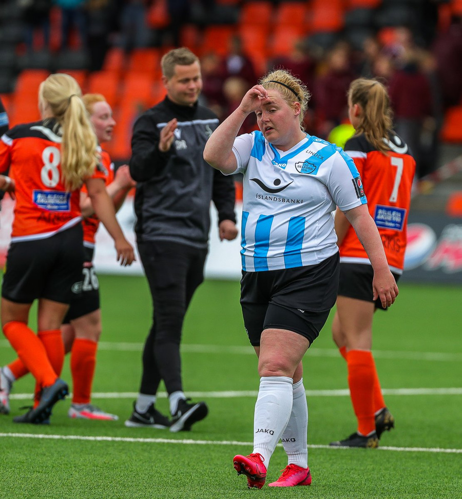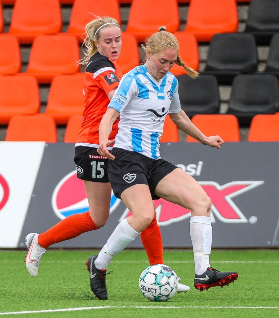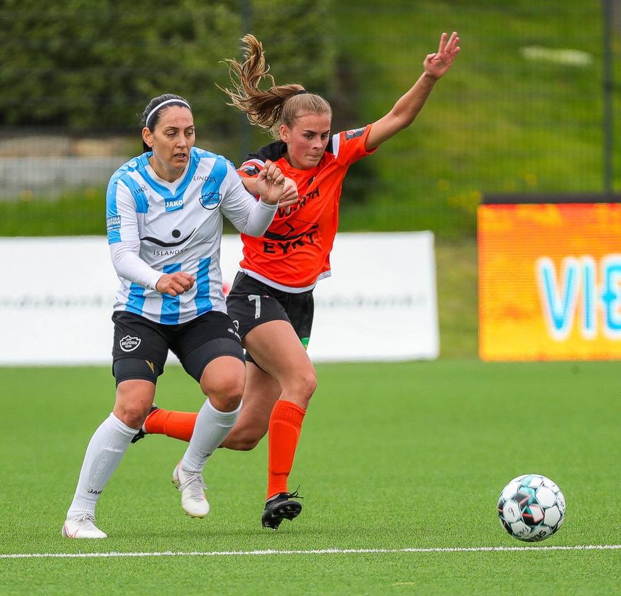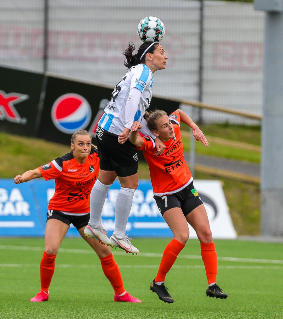 Nú fær Berglind Rós tiltal. Lét Bergrós finna vel fyrir sér úti við endalínu þegar boltinn var á leið úr leik.