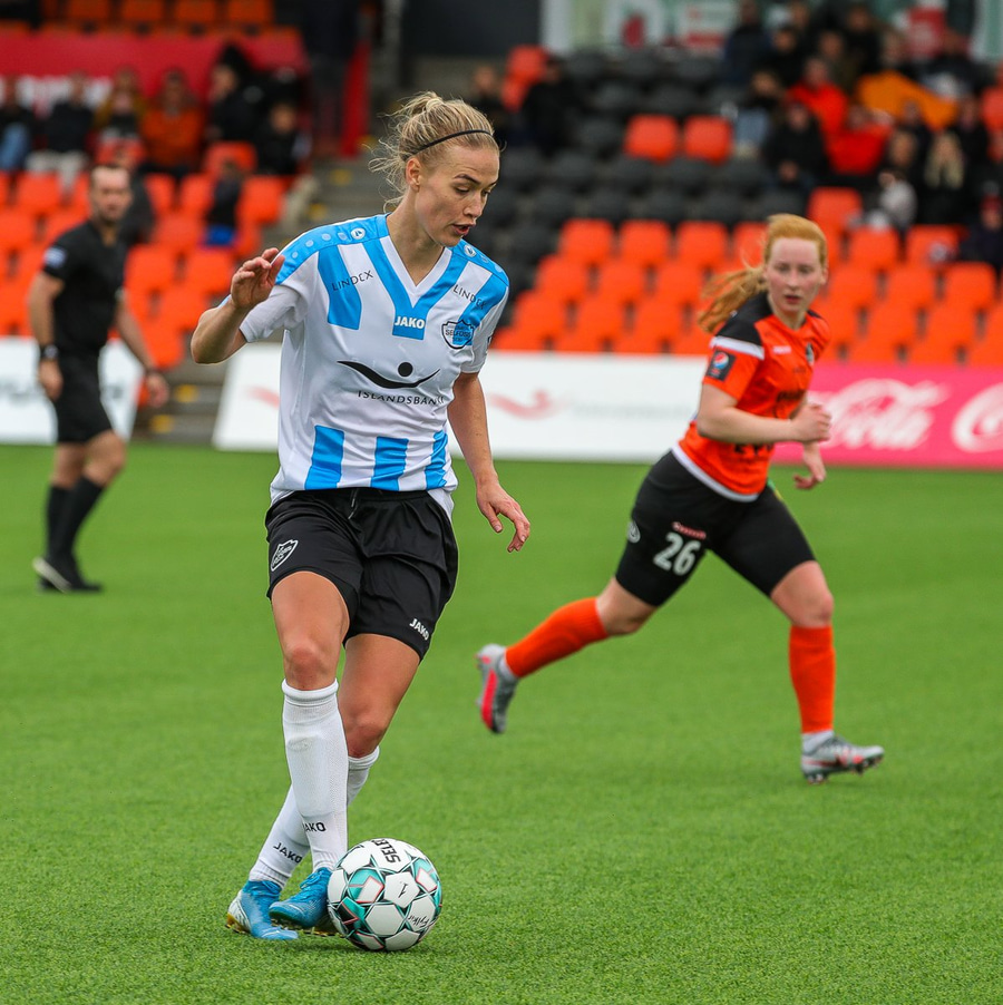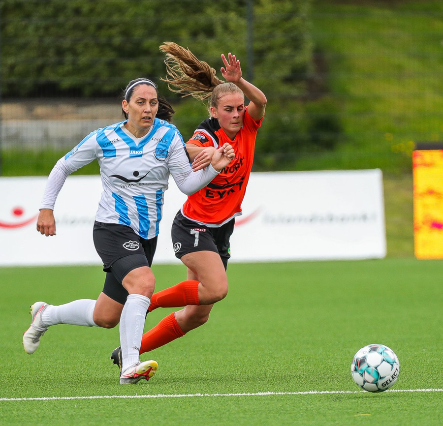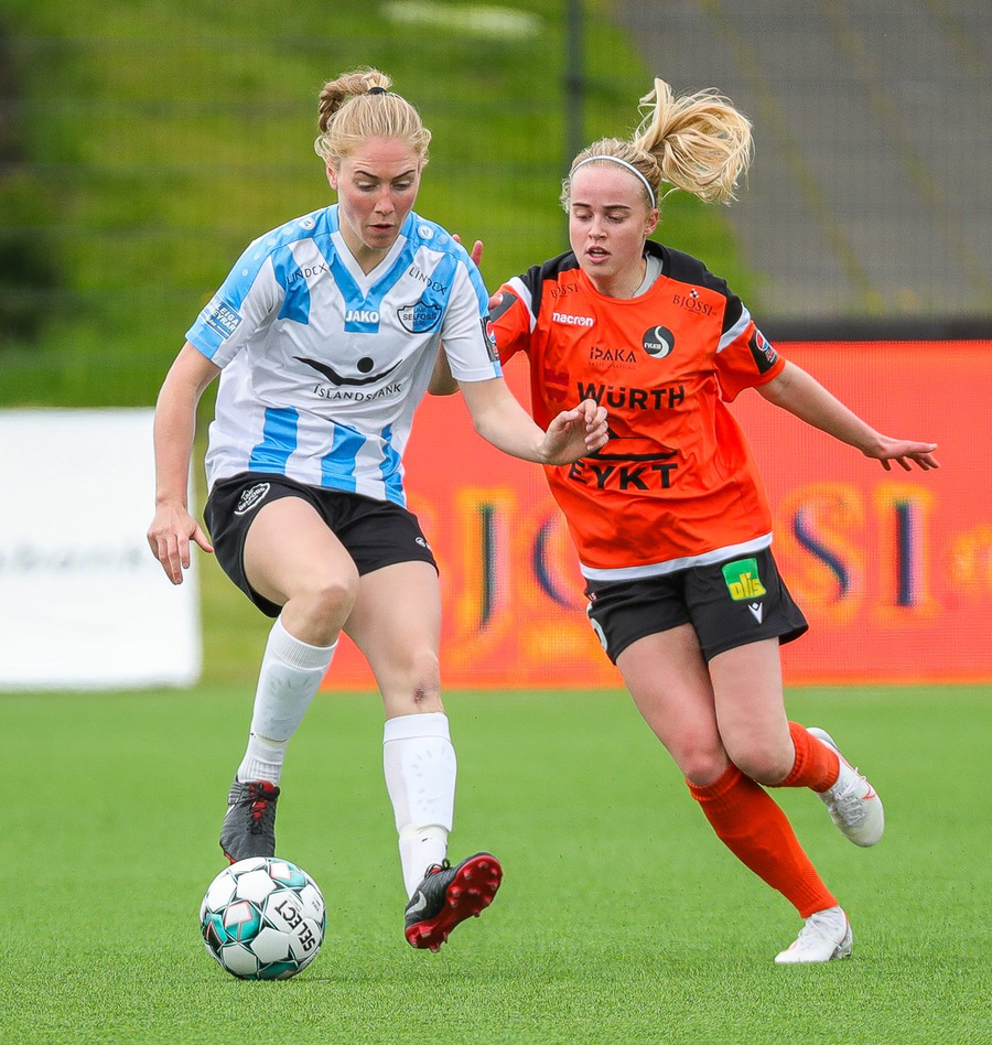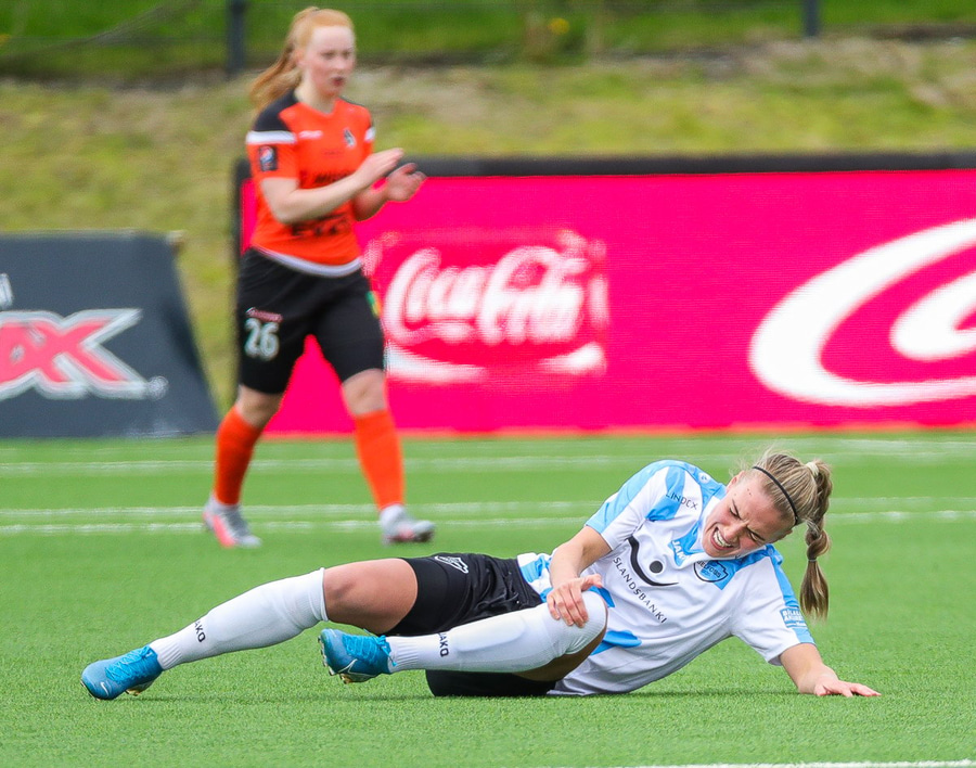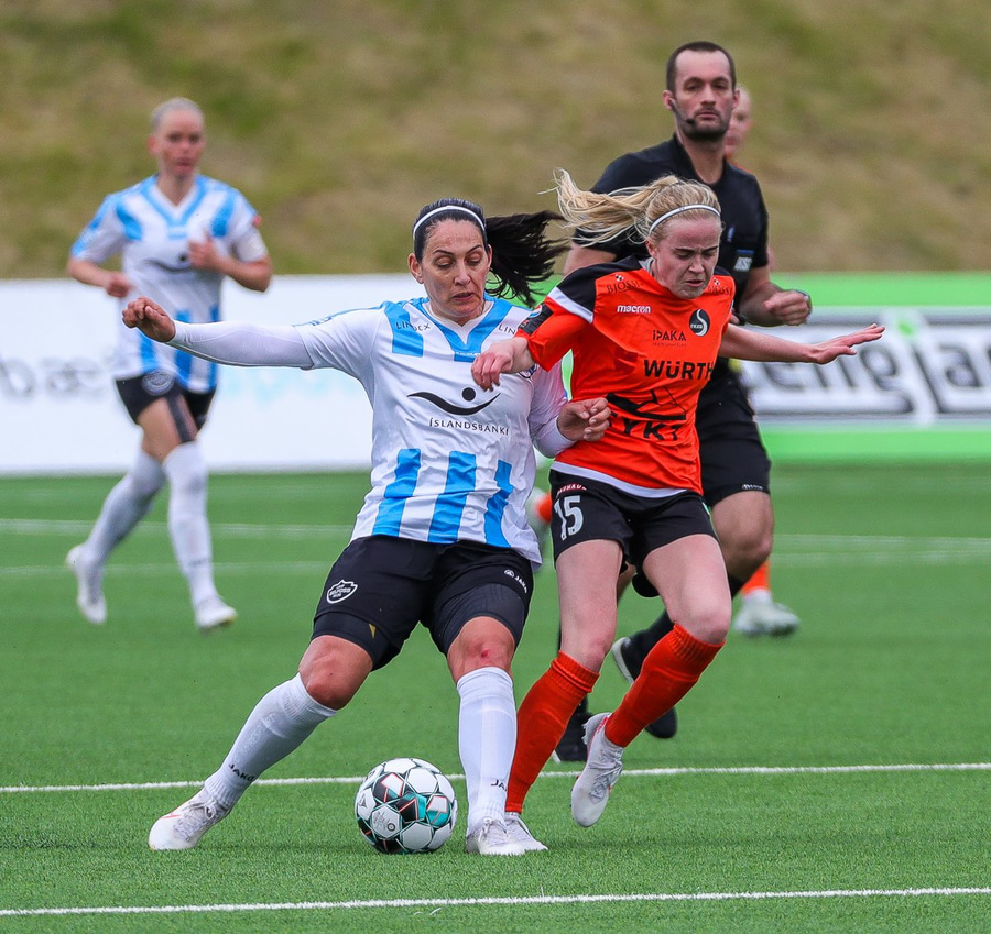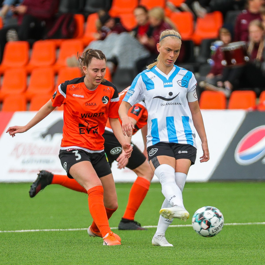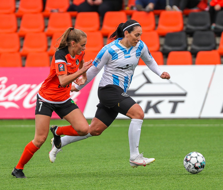 Nú fær Berglind Rós tiltal. Lét Bergrós finna vel fyrir sér úti við endalínu þegar boltinn var á leið úr leik.