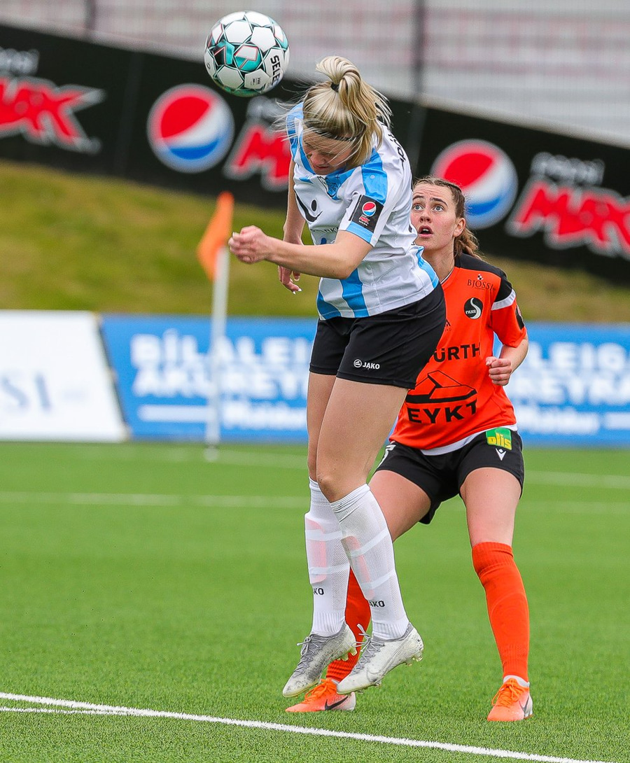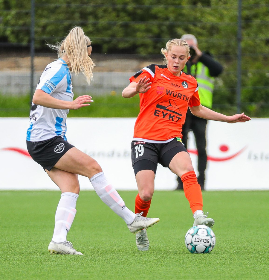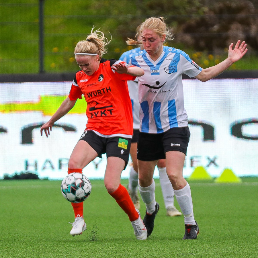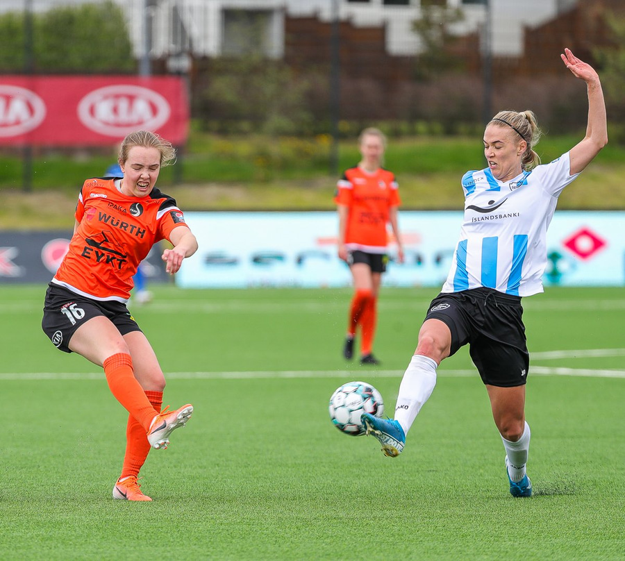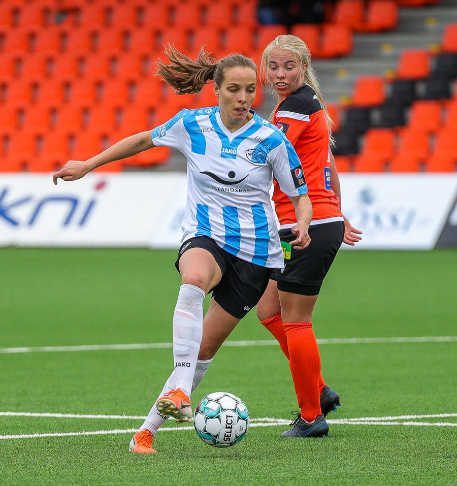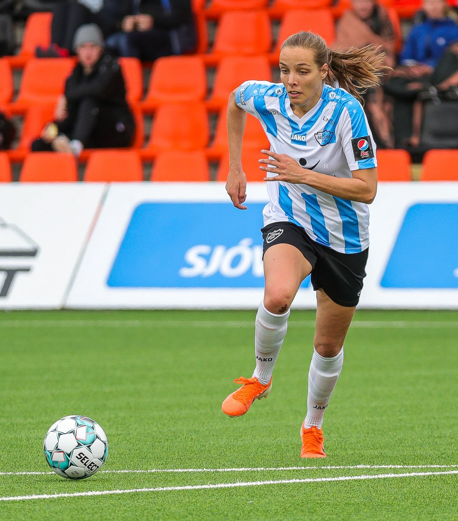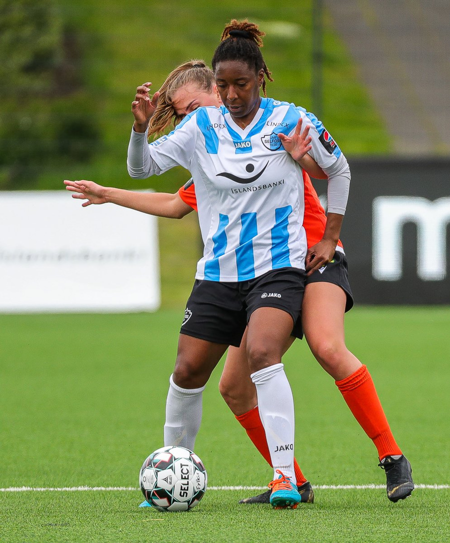 Nú fær Berglind Rós tiltal. Lét Bergrós finna vel fyrir sér úti við endalínu þegar boltinn var á leið úr leik.