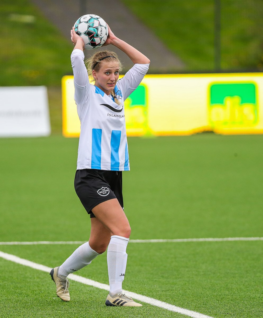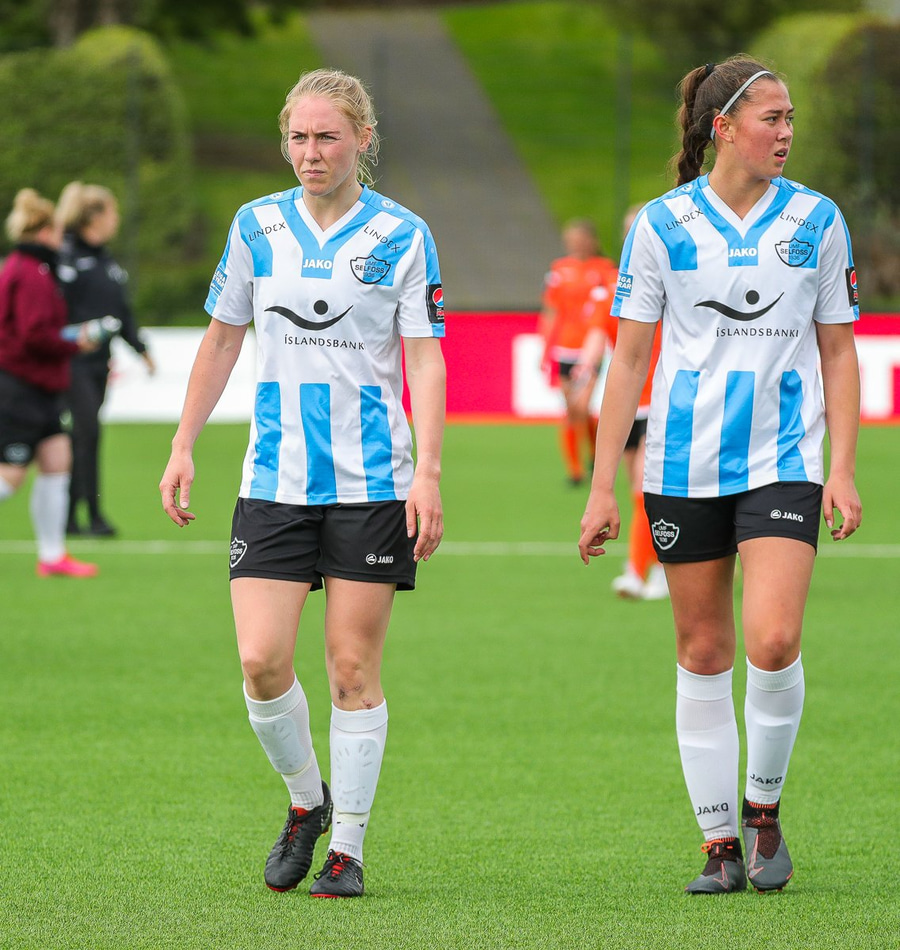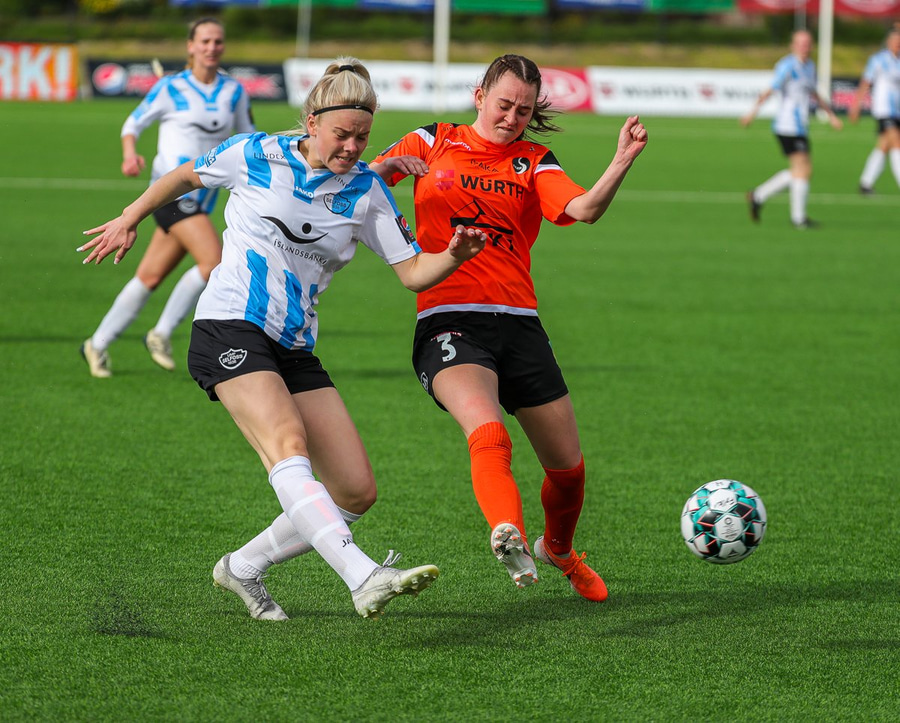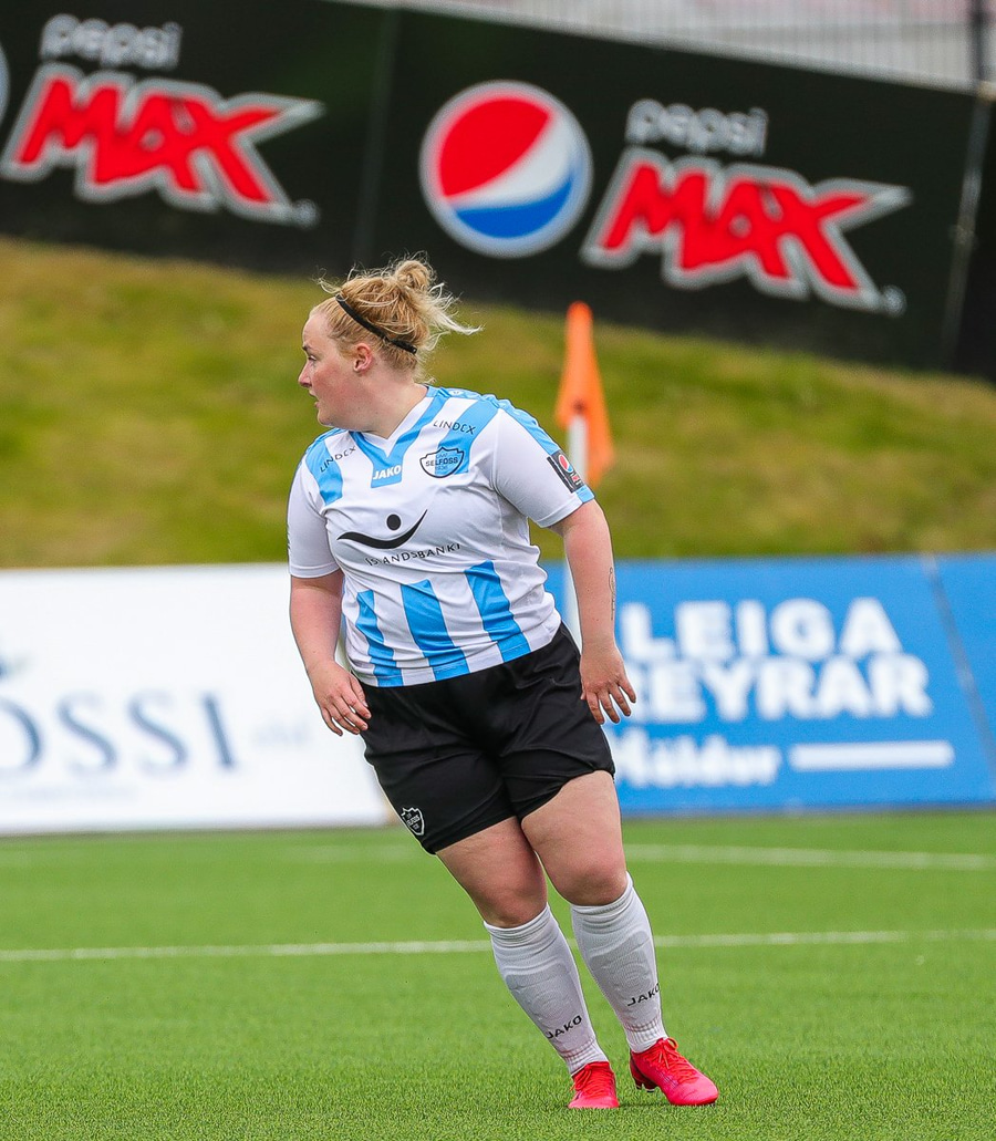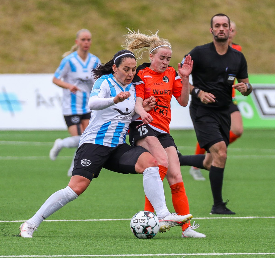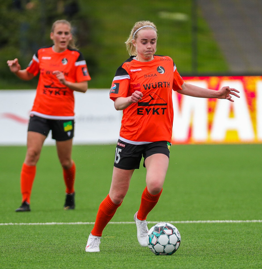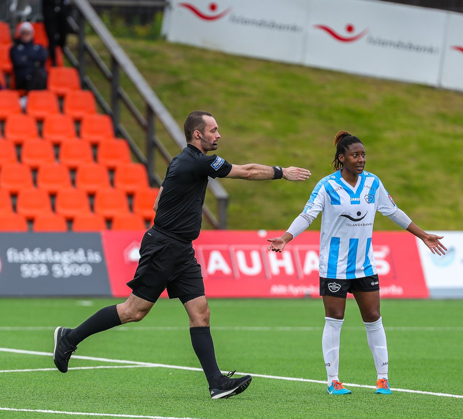 Nú fær Berglind Rós tiltal. Lét Bergrós finna vel fyrir sér úti við endalínu þegar boltinn var á leið úr leik.