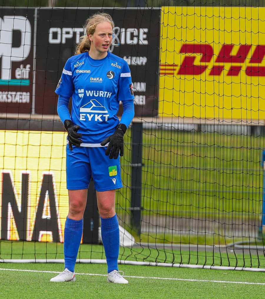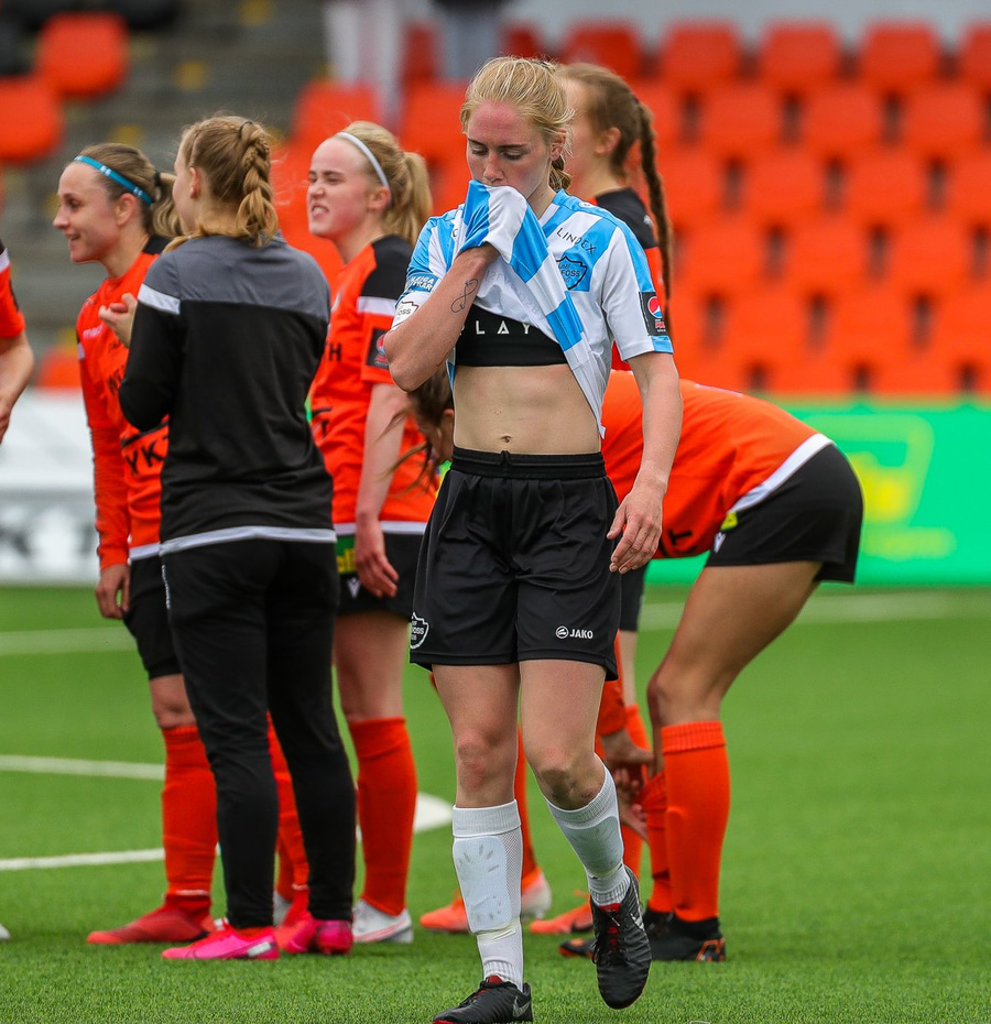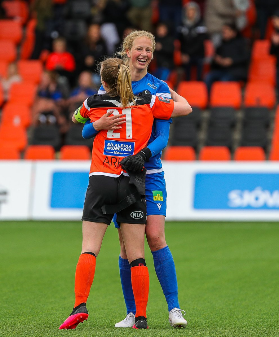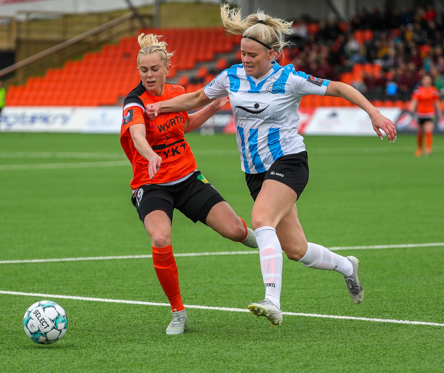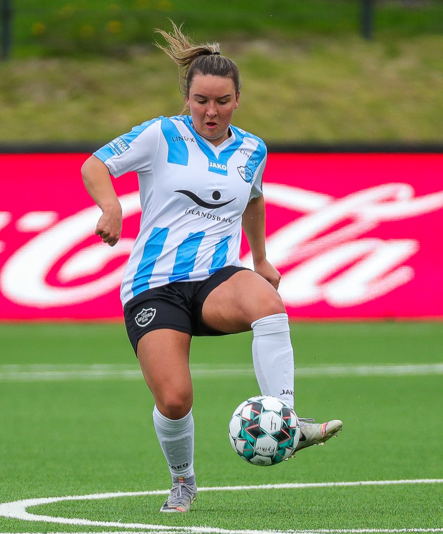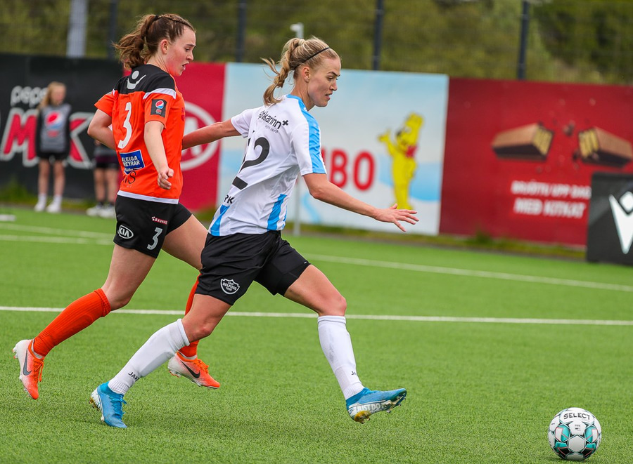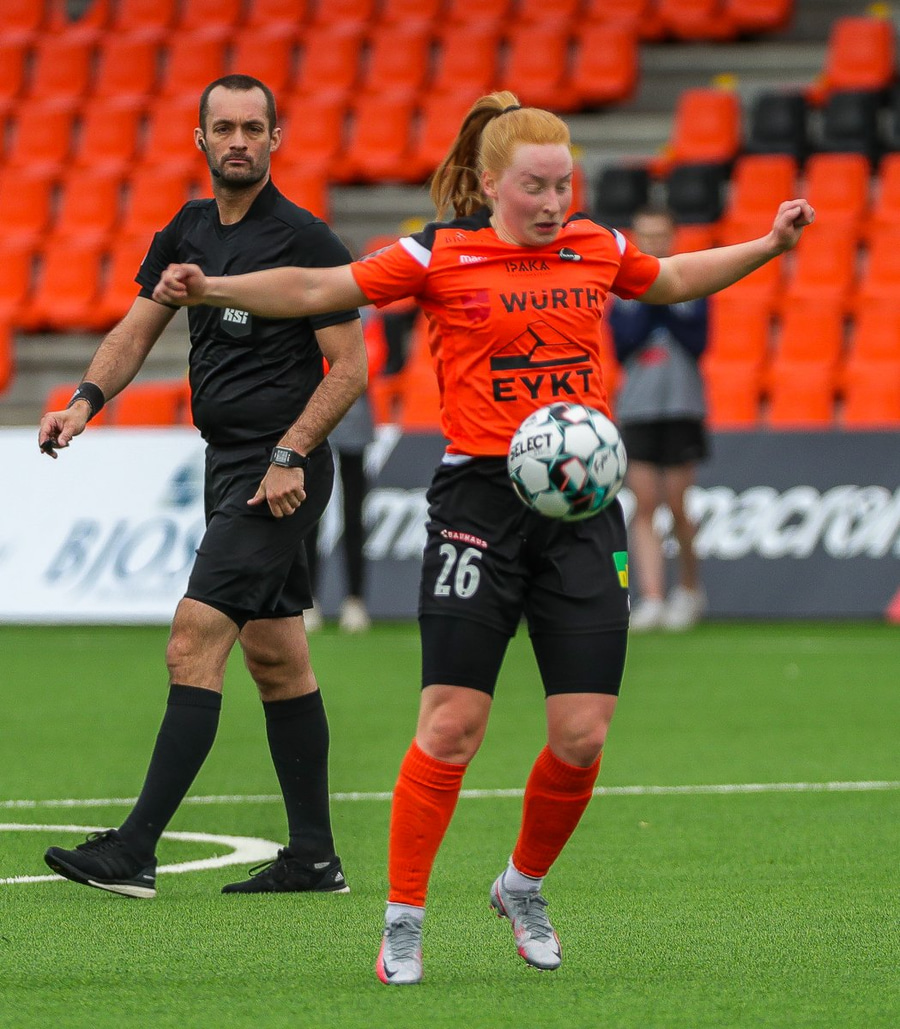 Nú fær Berglind Rós tiltal. Lét Bergrós finna vel fyrir sér úti við endalínu þegar boltinn var á leið úr leik.