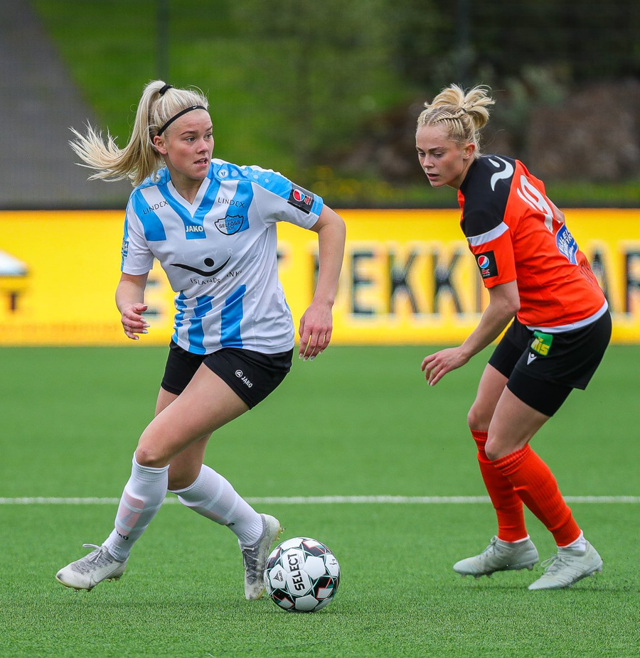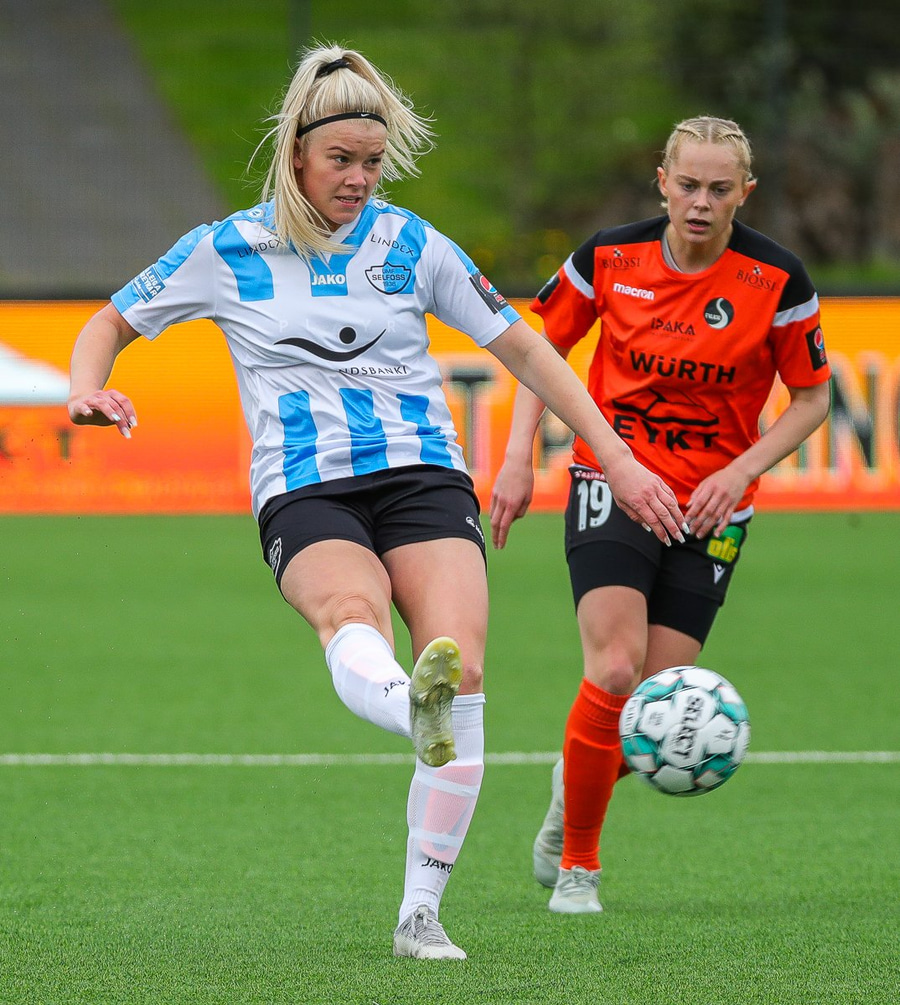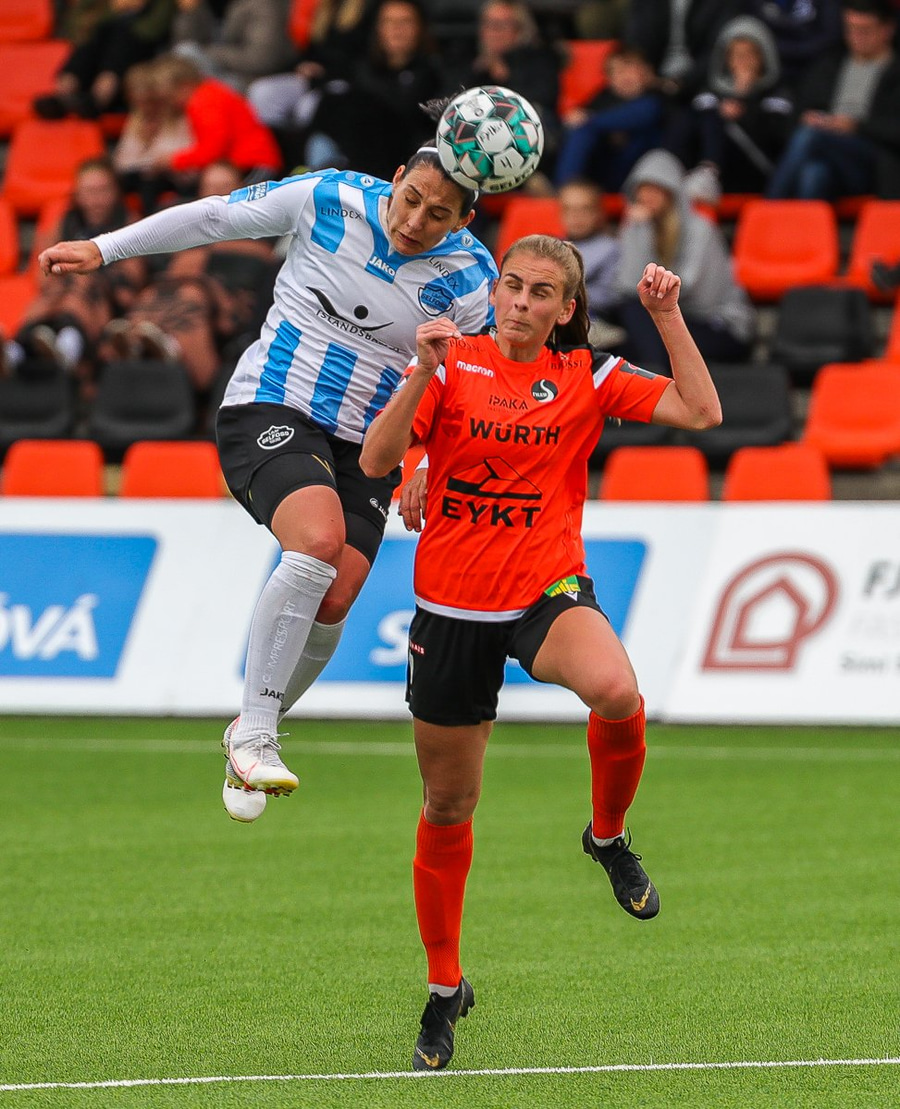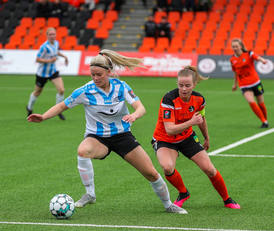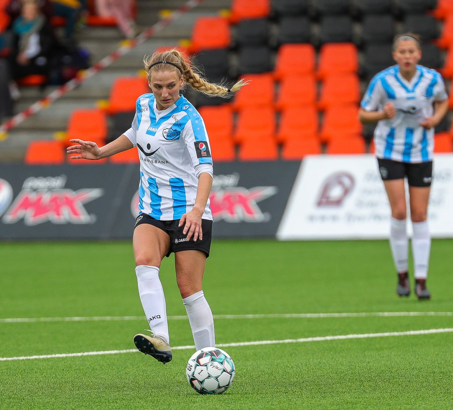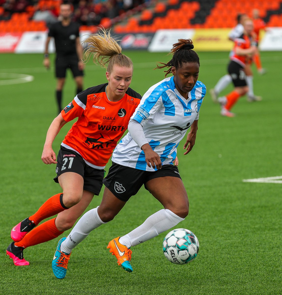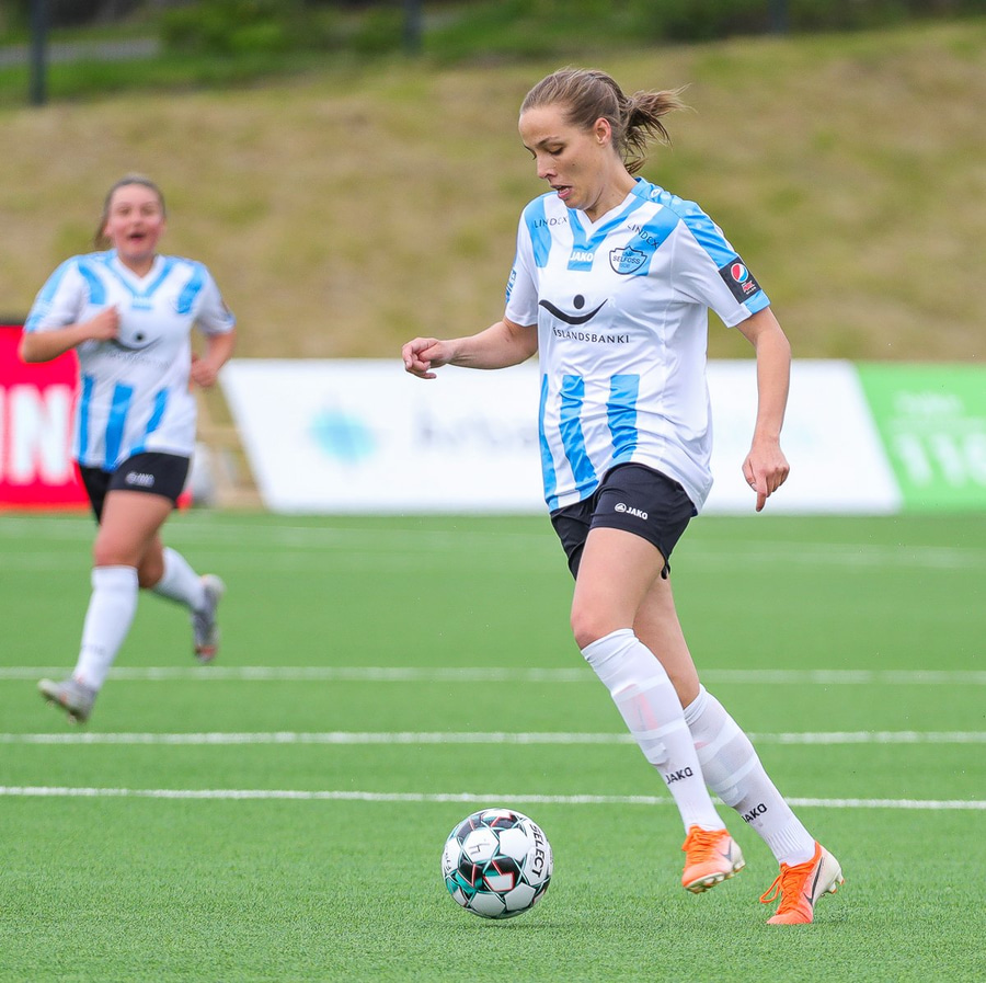 Nú fær Berglind Rós tiltal. Lét Bergrós finna vel fyrir sér úti við endalínu þegar boltinn var á leið úr leik.