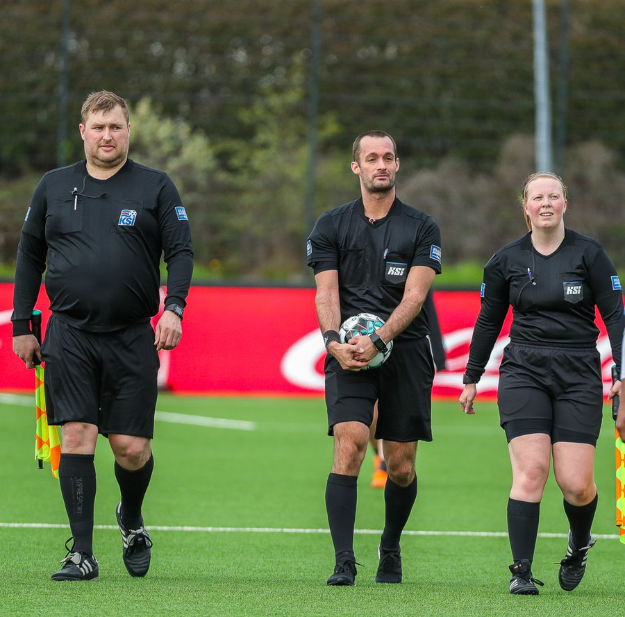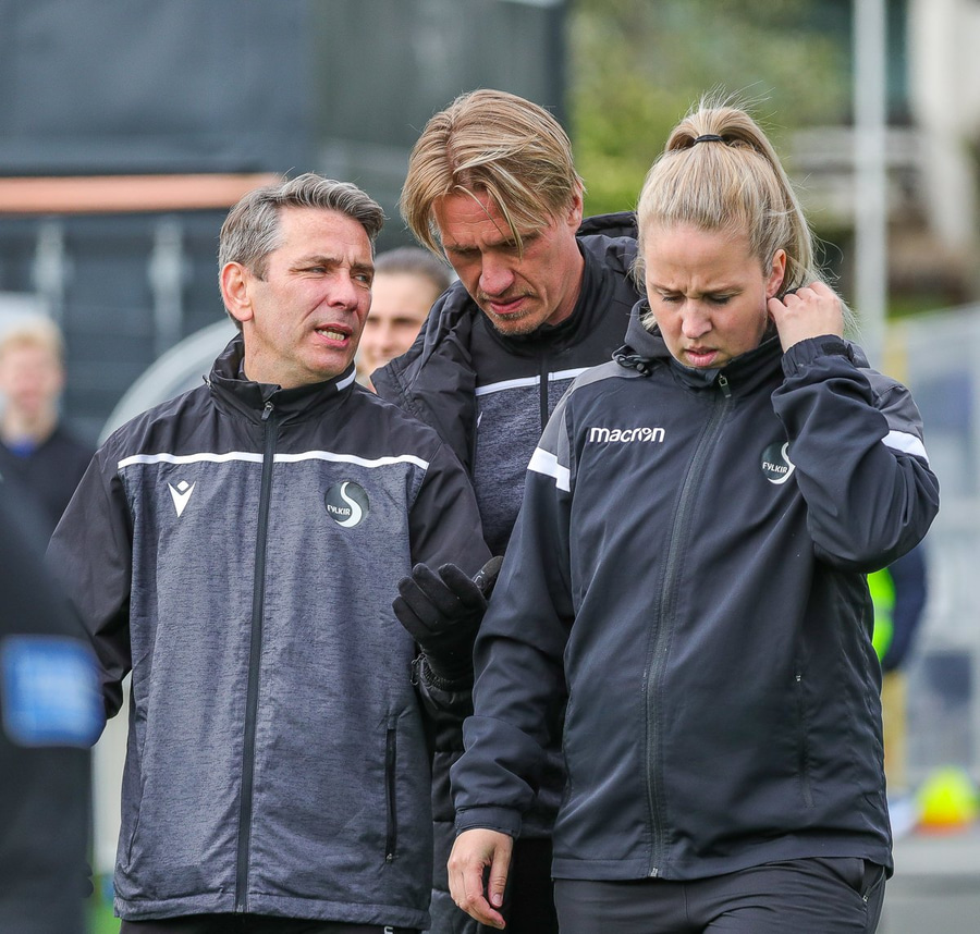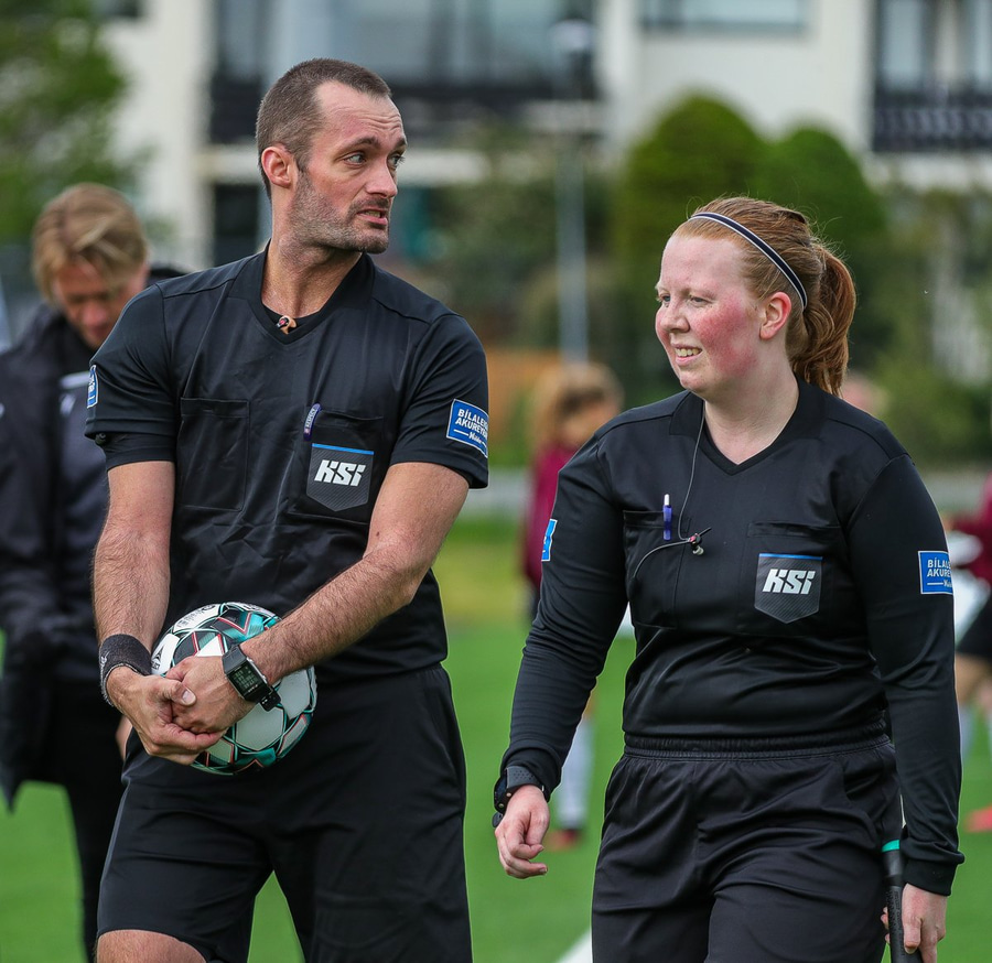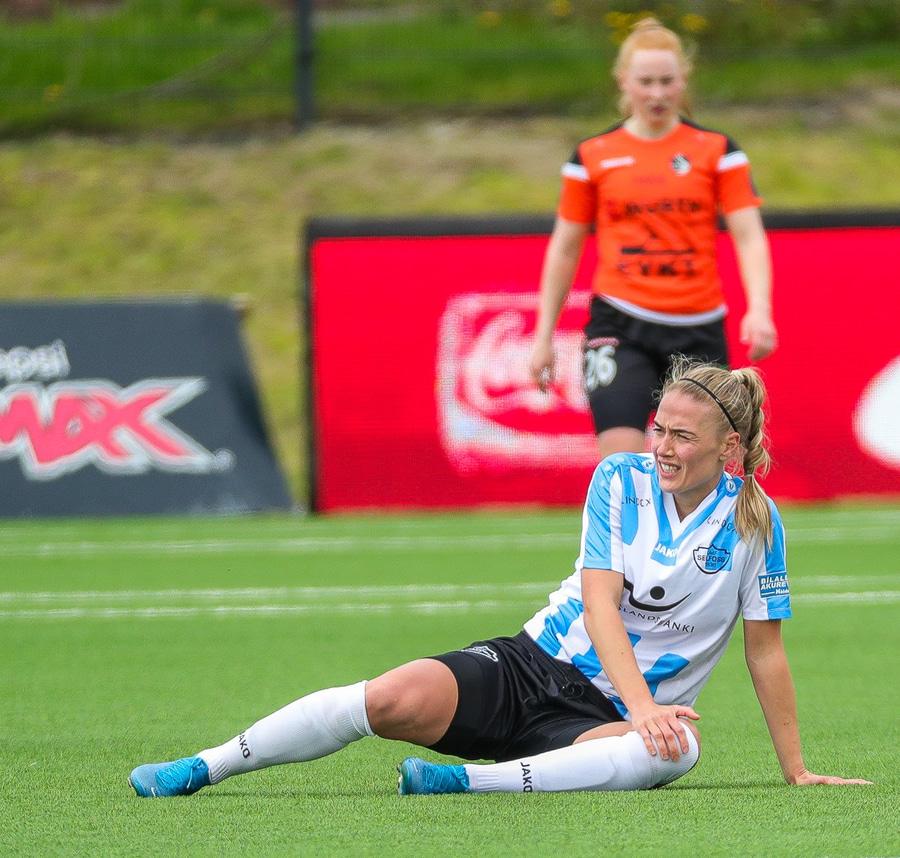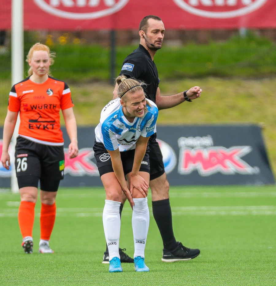 Á sama tíma rekast Dagný og Birkir dómari saman og Dagný fellur við. Smá skellur en hún hristir þetta af sér.