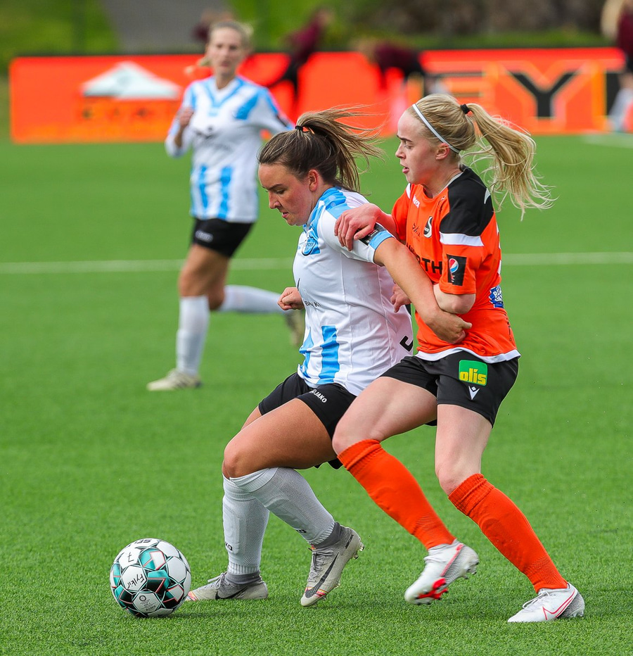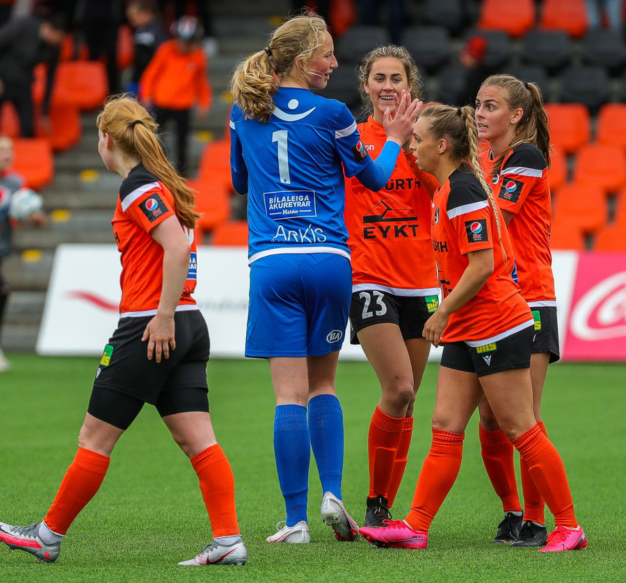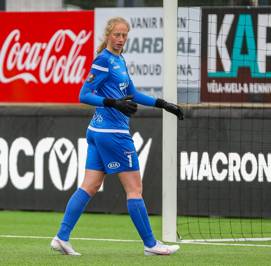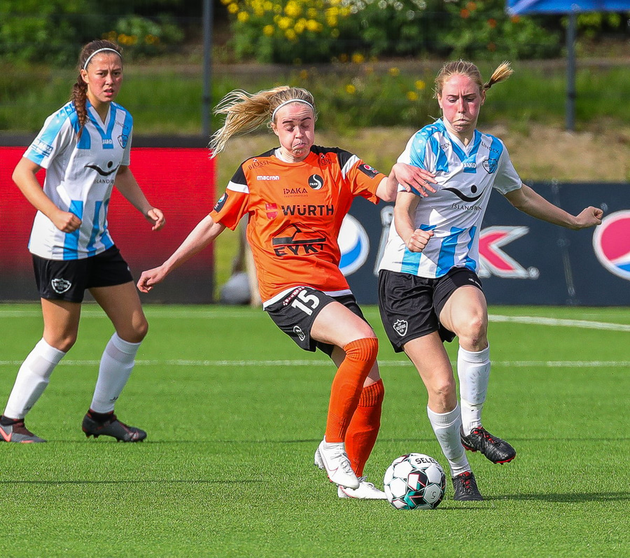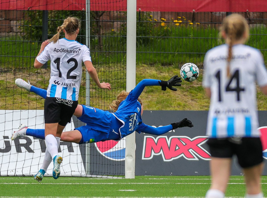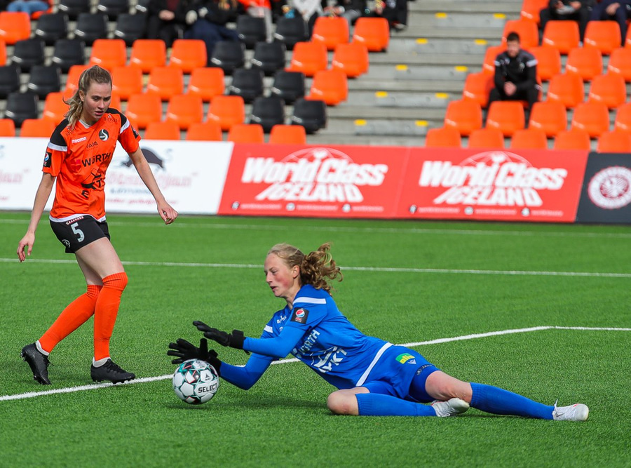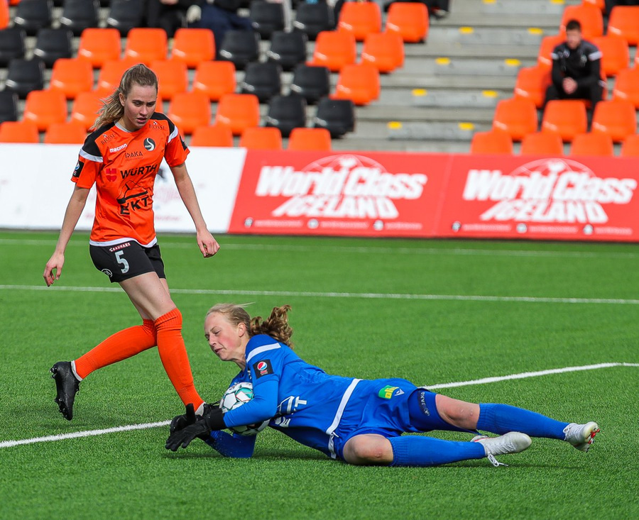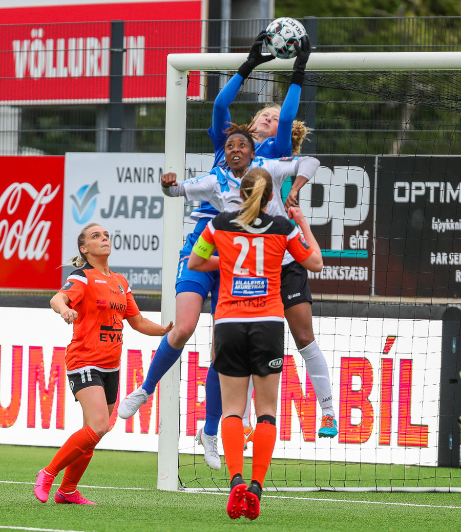 Bryndís kemst þá í fína stöðu. Með Sólveigu og Þórdísi með sér gegn tveimur varnarmönnum en nær ekki að skvera boltann fyrir hlaupið hjá samherja því Kaylan kemur vel út úr markinu og hreinsar.
