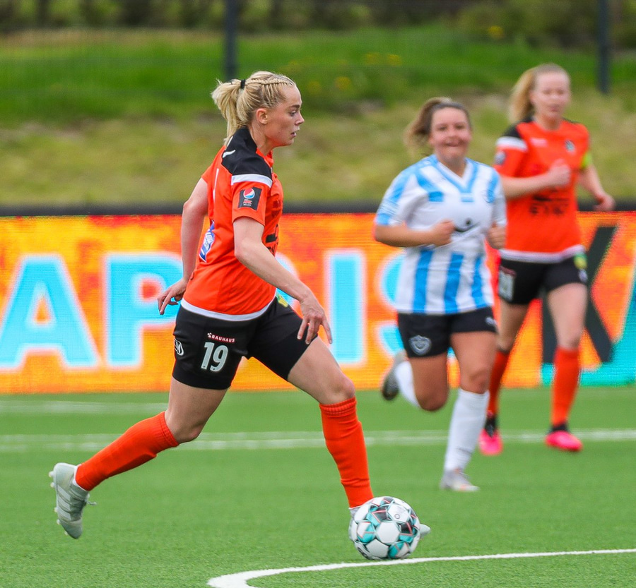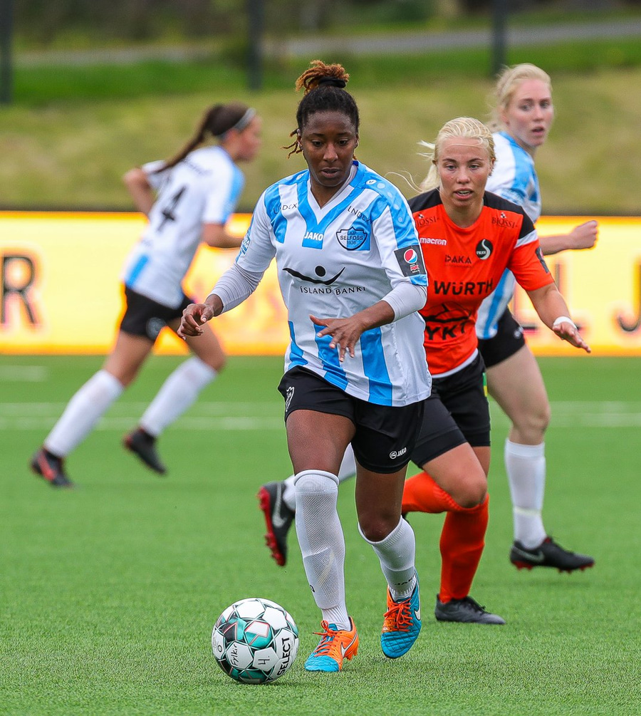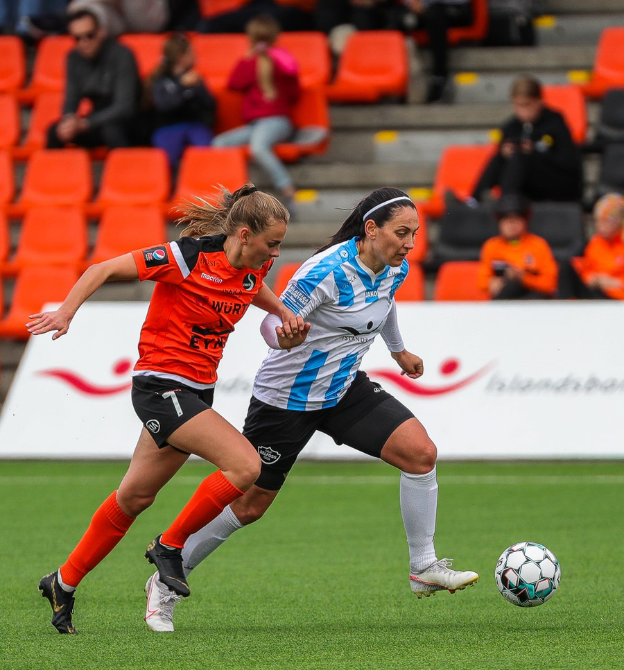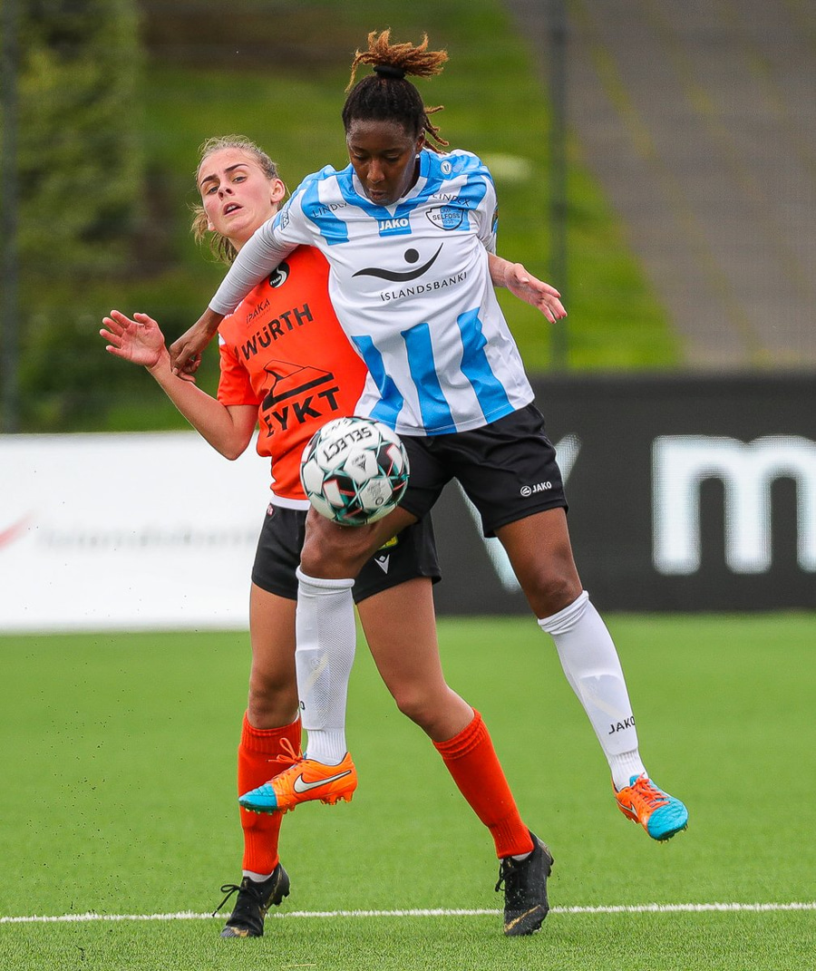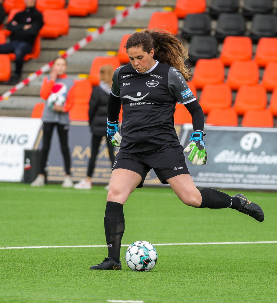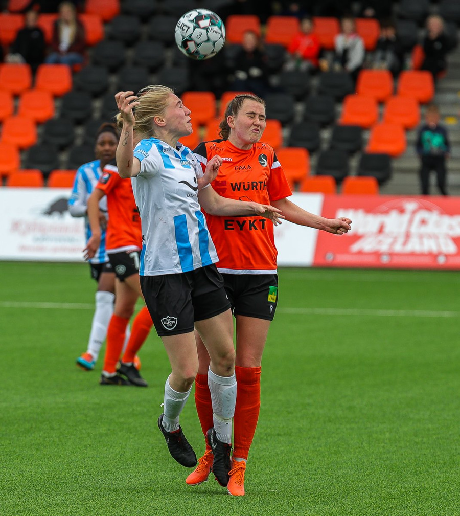 Bryndís kemst þá í fína stöðu. Með Sólveigu og Þórdísi með sér gegn tveimur varnarmönnum en nær ekki að skvera boltann fyrir hlaupið hjá samherja því Kaylan kemur vel út úr markinu og hreinsar.